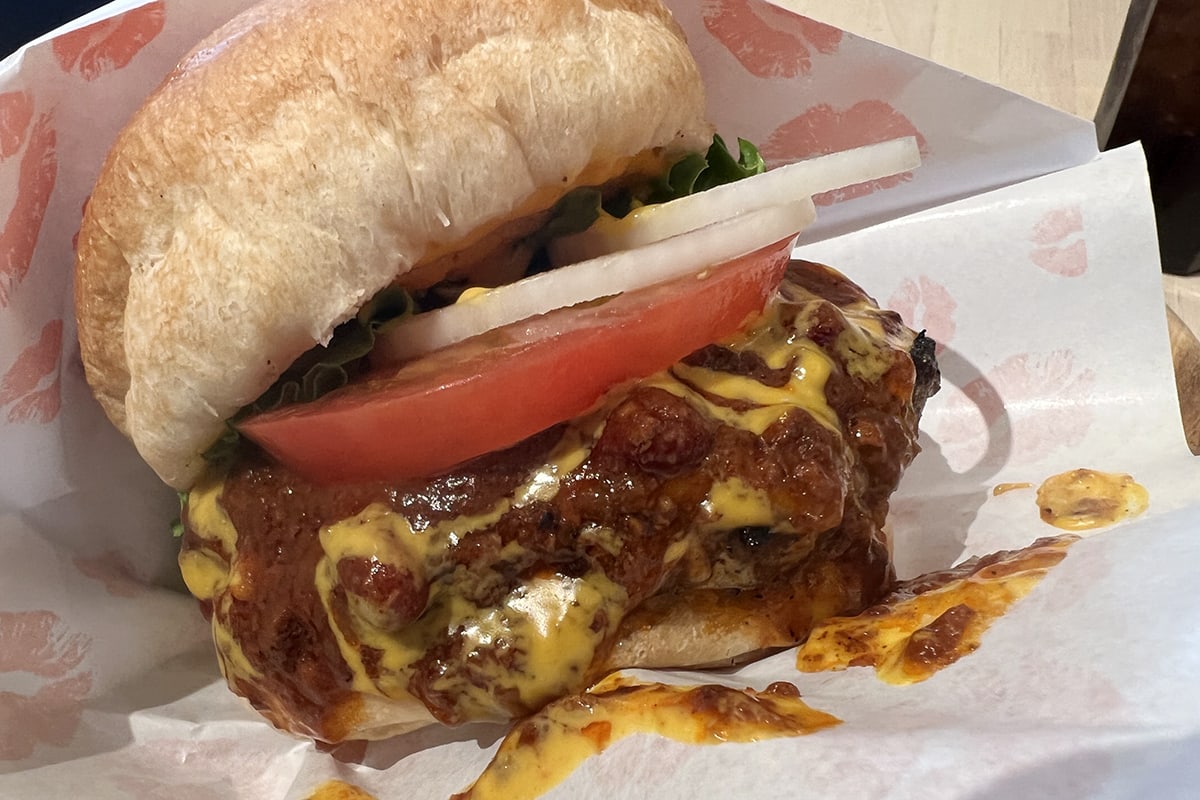 寒いので身体があたためまるようなメニューを選びたい。なのでスパイシーなチリソースたっぷりのチリチーズバーガーをオーダー。ふっくらこんもりと高さのあるバンズが特徴的。まるでダイヤモンドヘッドの丘を彷彿とさせるかたちだ。