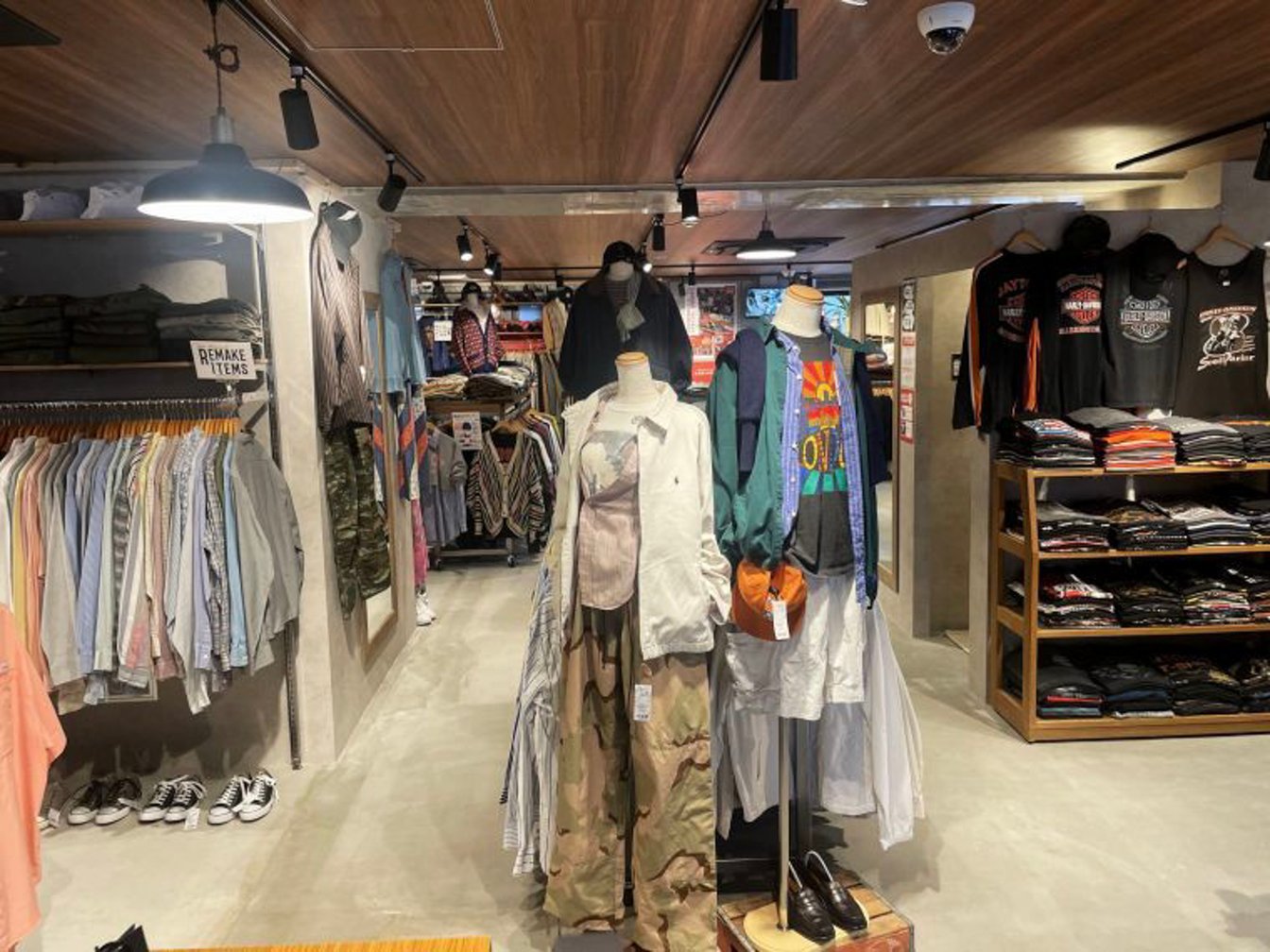 新築ビルの2階に開いた下北沢店は、売り場面積は約200平方メートル。既存の古着屋JAMに比べれば小ぶりだが、6000~7000点の古着を詰め込んで幅広い客層が楽しめる店作りを目指した。下北沢は古着店が数多く、古着好きが多く集まる街。古着屋JAMは、全国の主要都市に出店を進めているが、「すでに進出していると思っているお客様もいた」下北沢にようやく出店を実現した。2階にあるが、外からも分かりやすい外観にし、誰もが入りやすいような店も意識した。