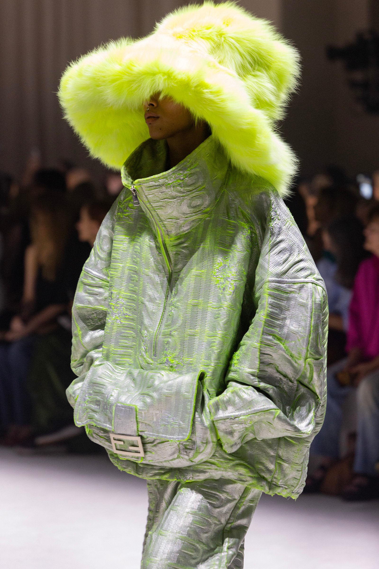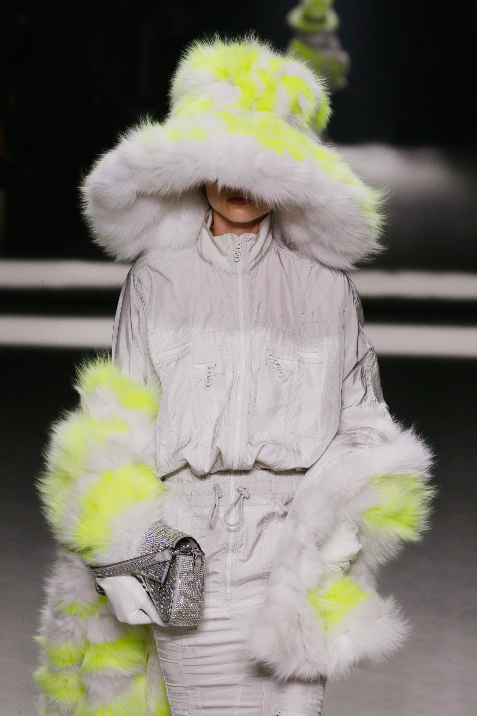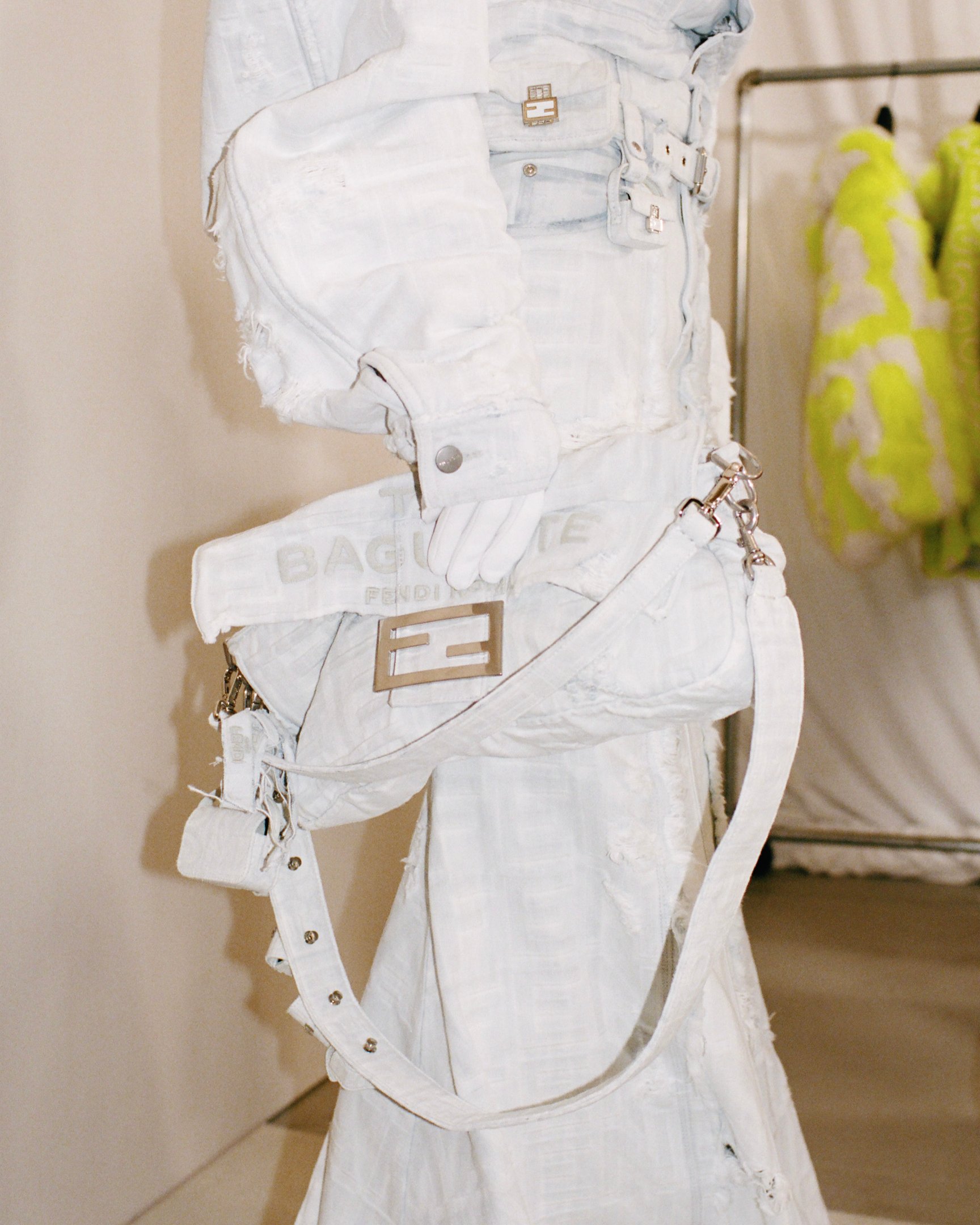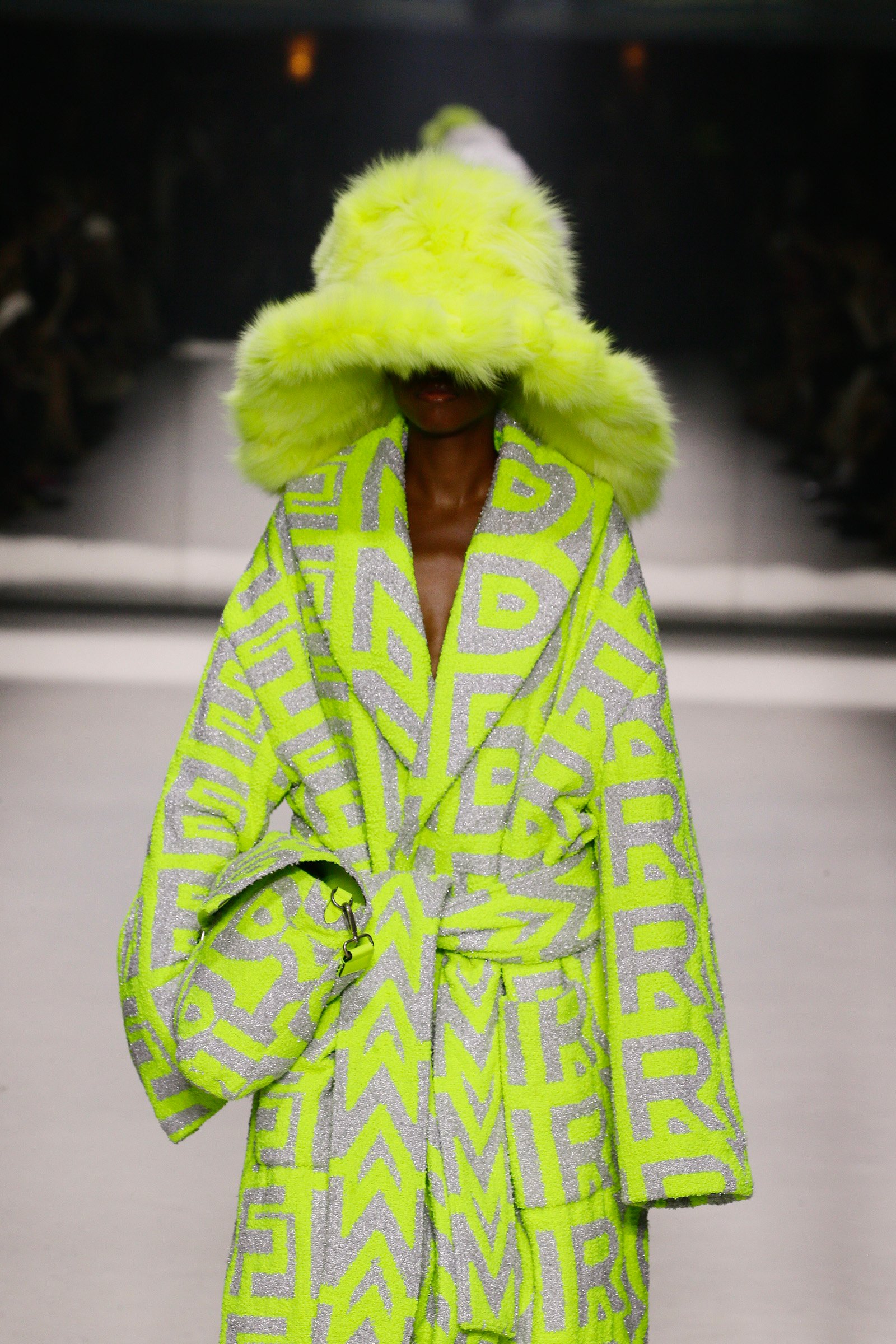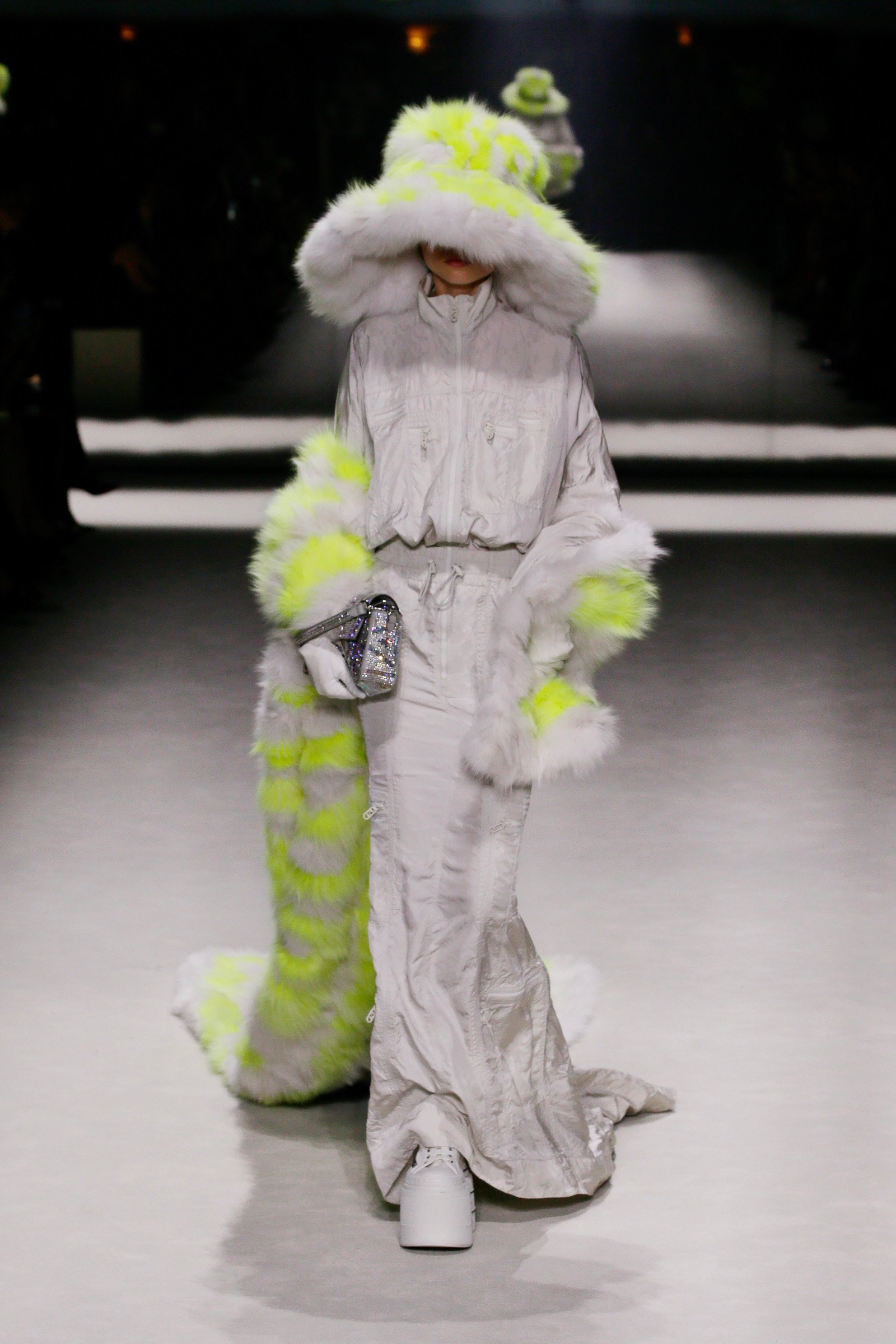 マーク?ジェイコブスは、長年の交友関係にあるキム?ジョーンズやフェンディのアイコニックなアイテムである「バゲット」と、バゲットを誕生させたメゾンに対する敬意をコレクションで表現したという。コレクションでは、パラシュートトレーンスカート、バルーンバックのブロークンデニムジャケット、セロファンのオペラケープ蛍光色のリサイクルファーのストールやハットなどを用意。ラインストーンやシルバー、蛍光イエローは、ニューヨークの路上で散見されるガラス張りの建物や、作業員の安全ベストから着想を得たという。