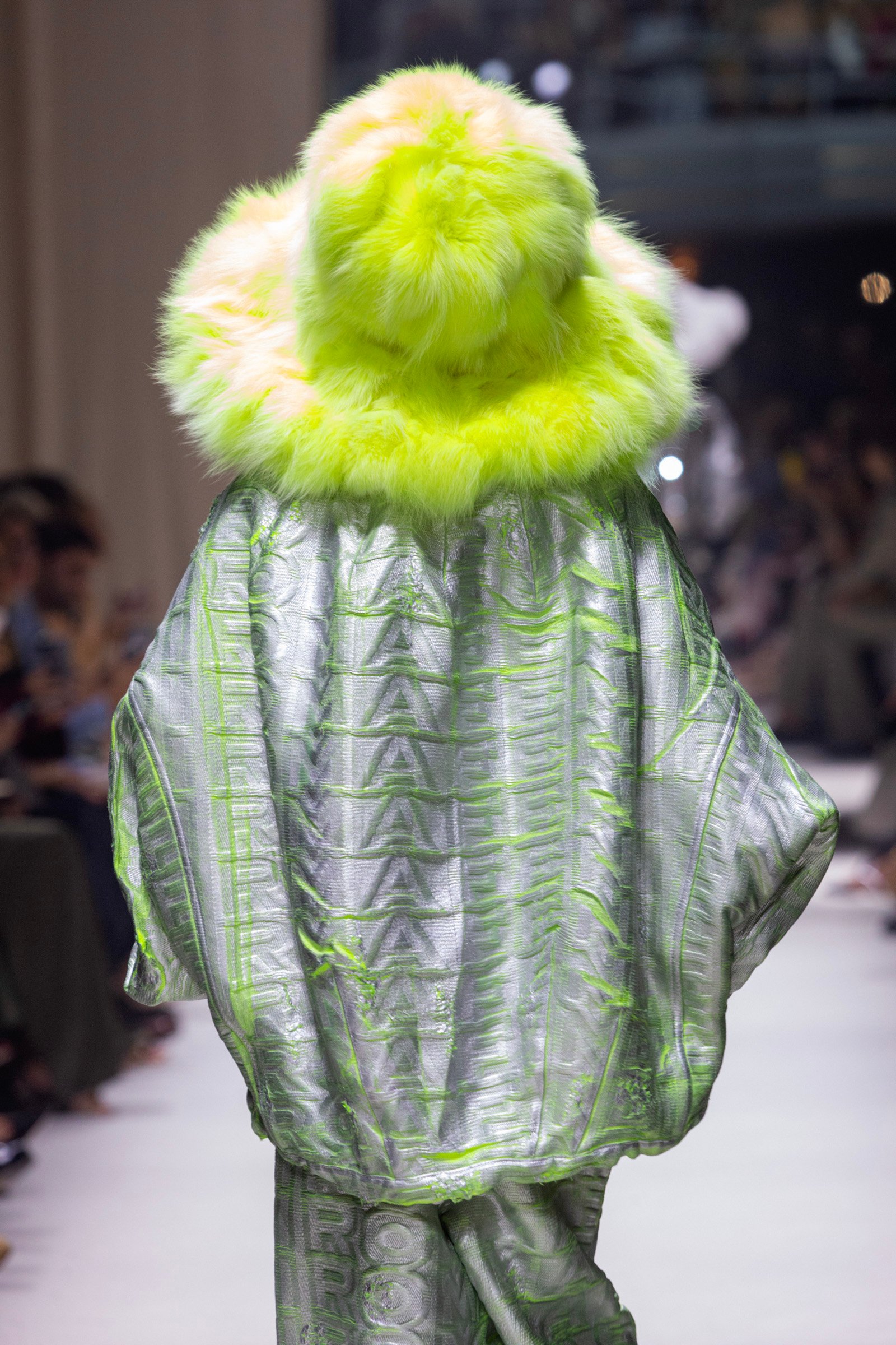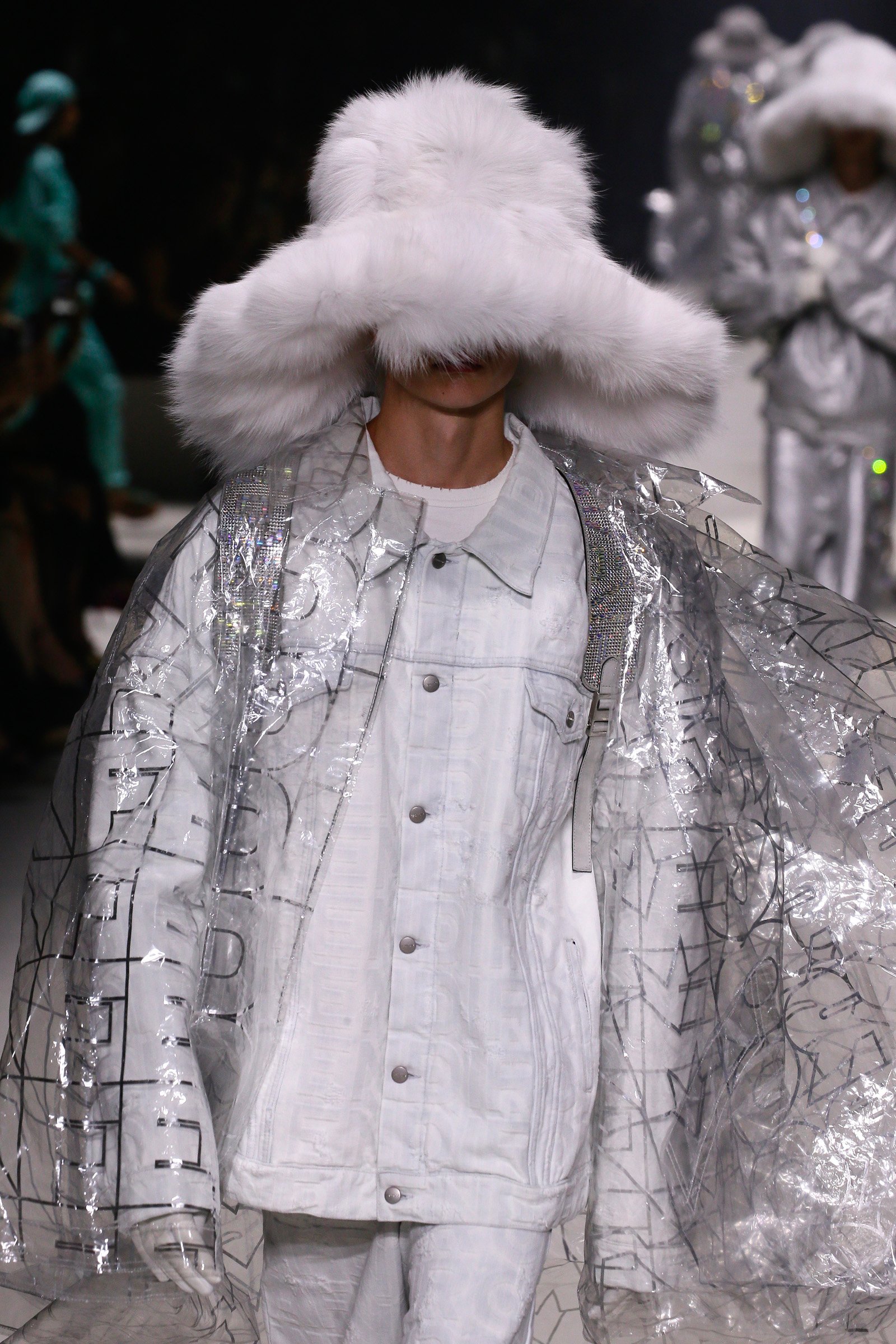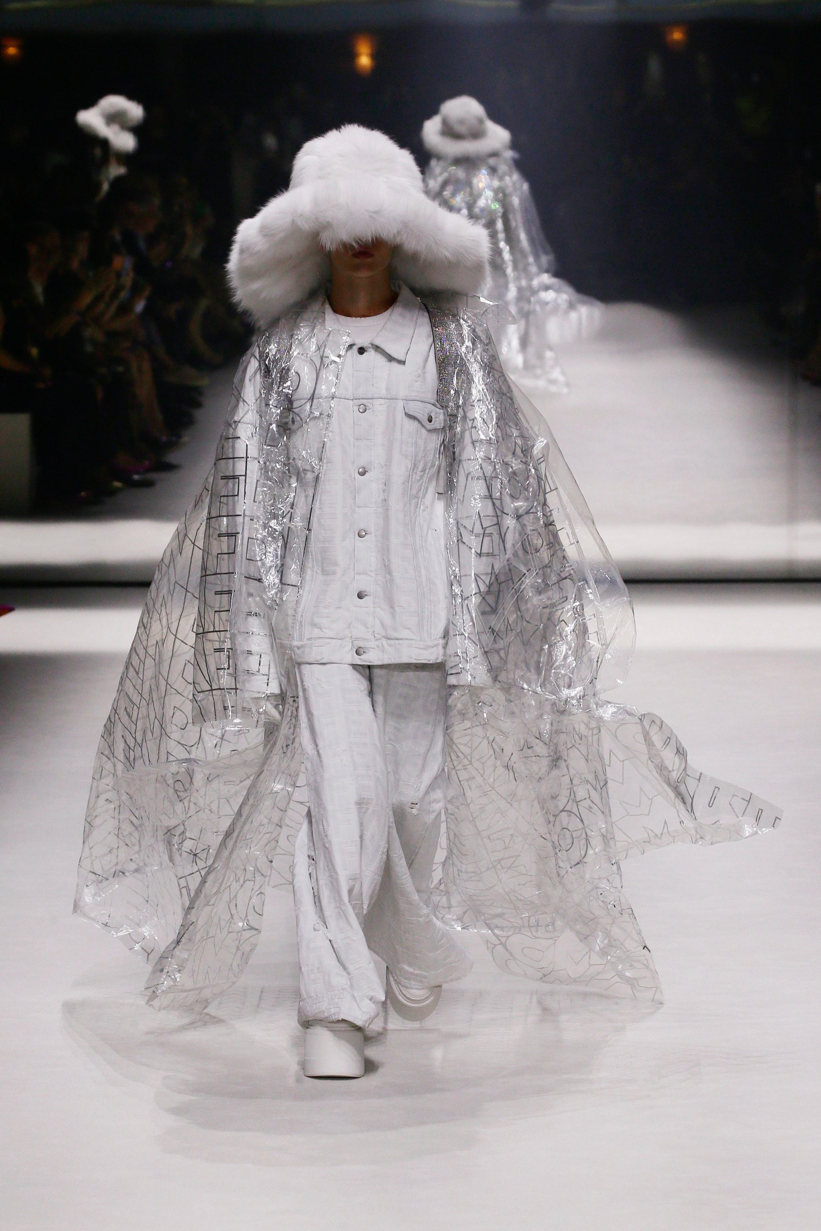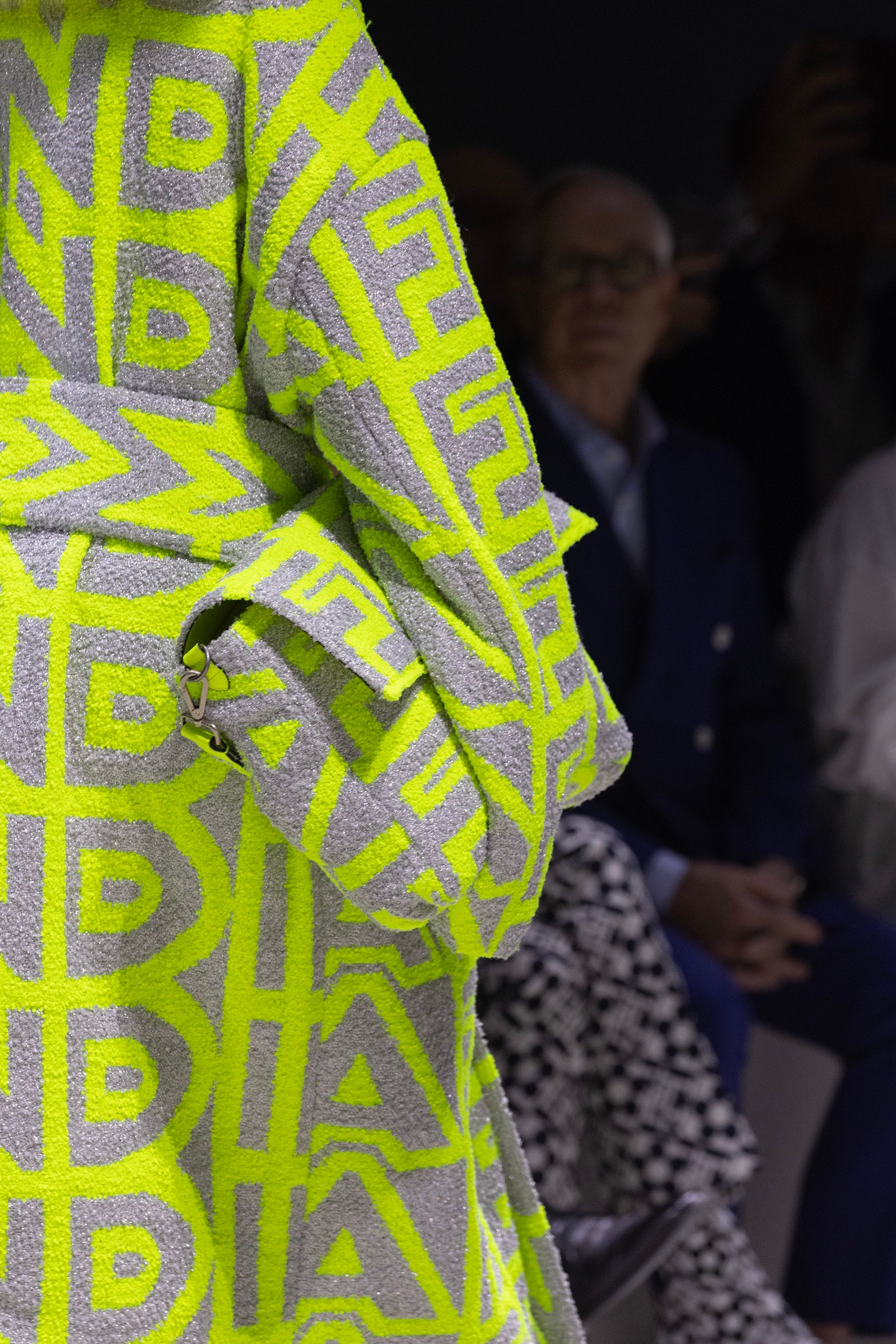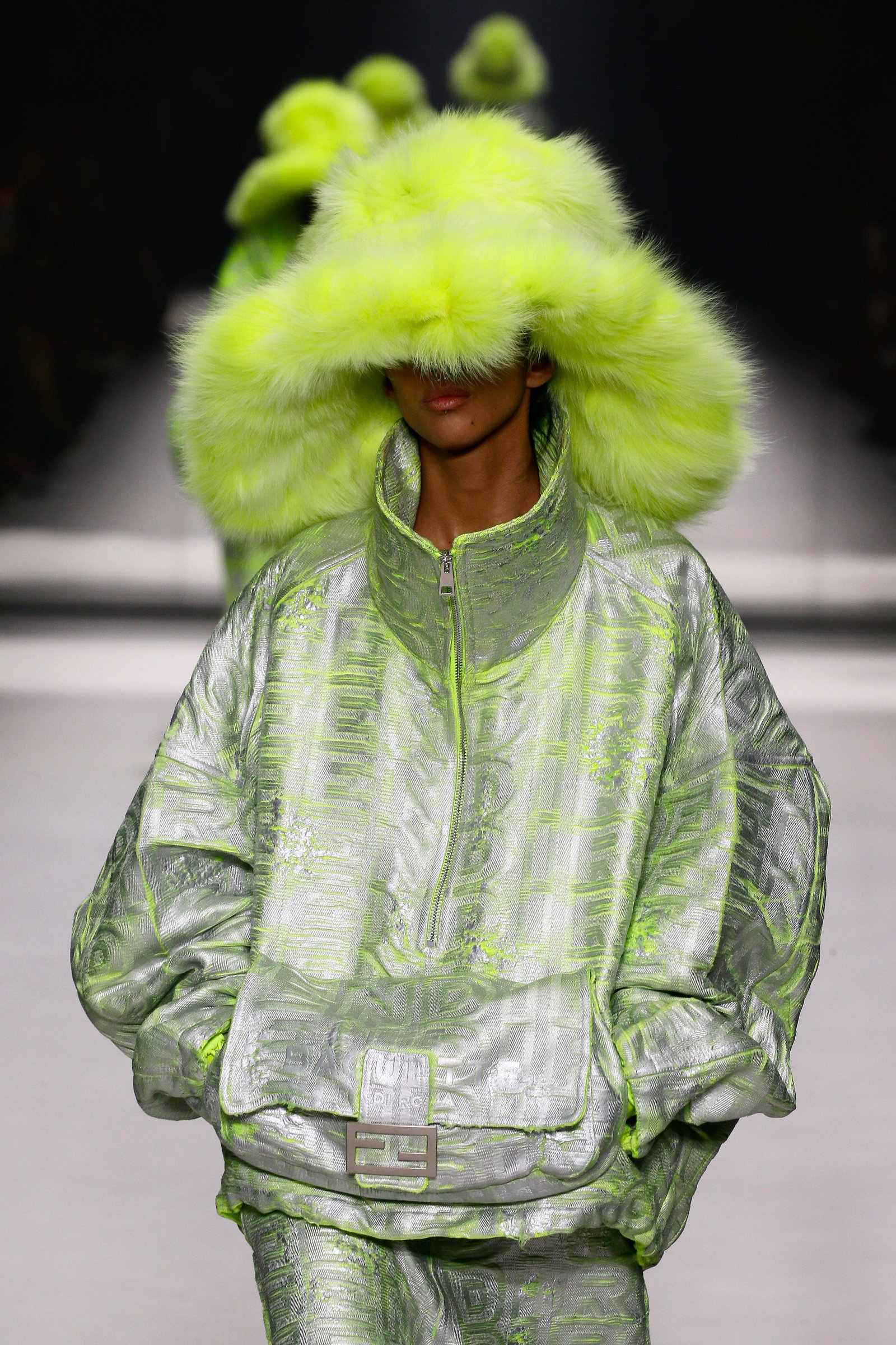 マーク?ジェイコブスは、長年の交友関係にあるキム?ジョーンズやフェンディのアイコニックなアイテムである「バゲット」と、バゲットを誕生させたメゾンに対する敬意をコレクションで表現したという。コレクションでは、パラシュートトレーンスカート、バルーンバックのブロークンデニムジャケット、セロファンのオペラケープ蛍光色のリサイクルファーのストールやハットなどを用意。ラインストーンやシルバー、蛍光イエローは、ニューヨークの路上で散見されるガラス張りの建物や、作業員の安全ベストから着想を得たという。