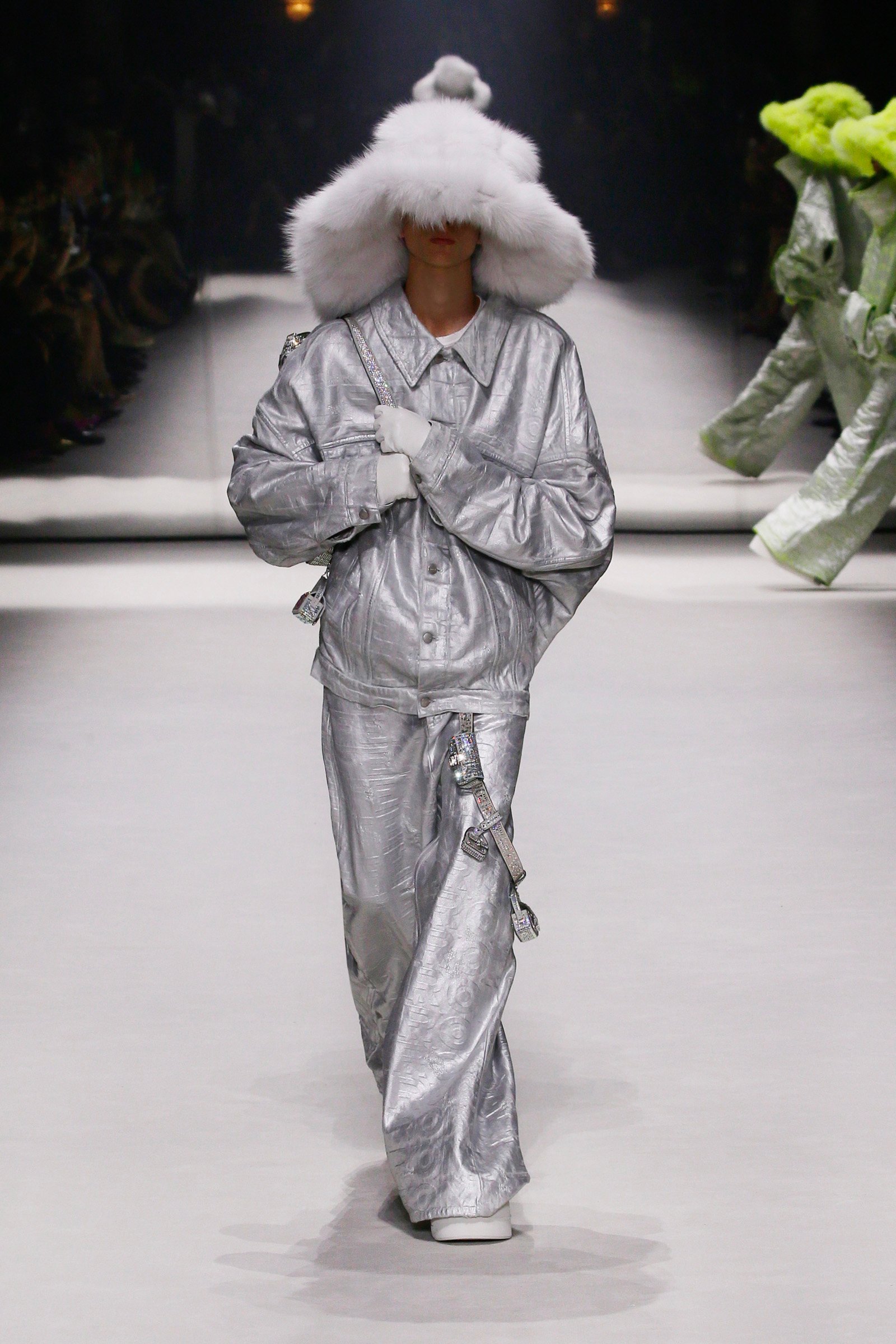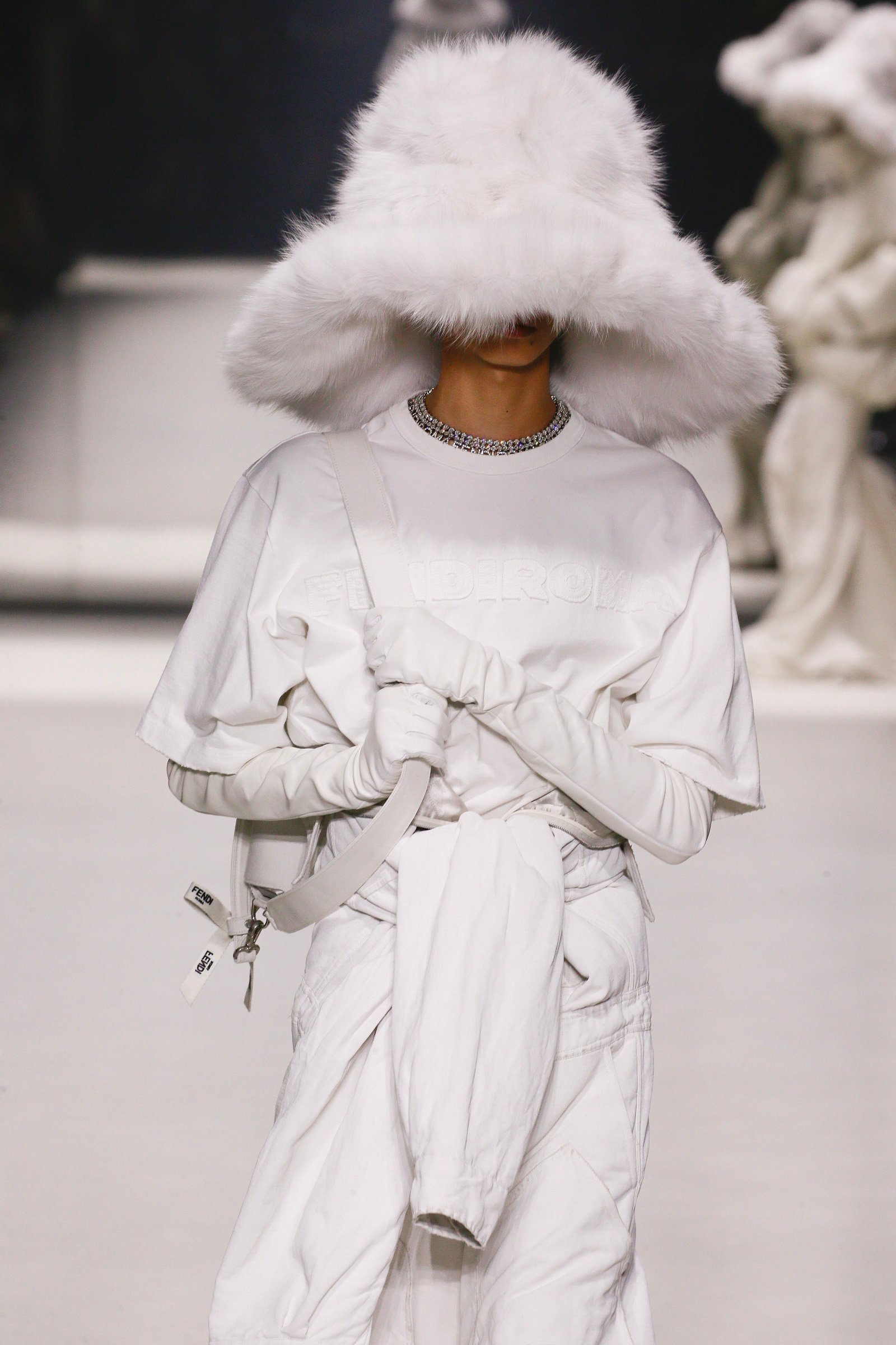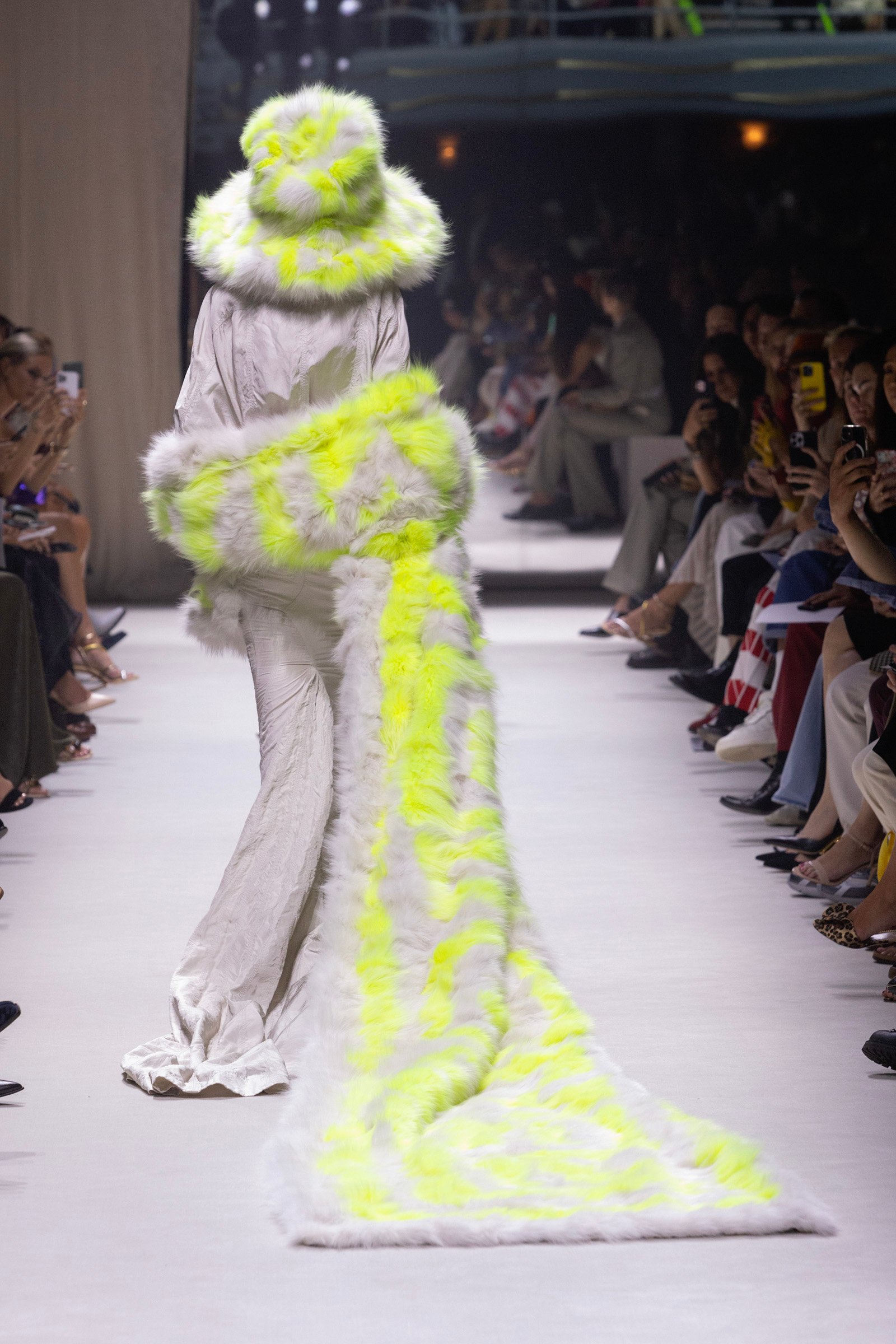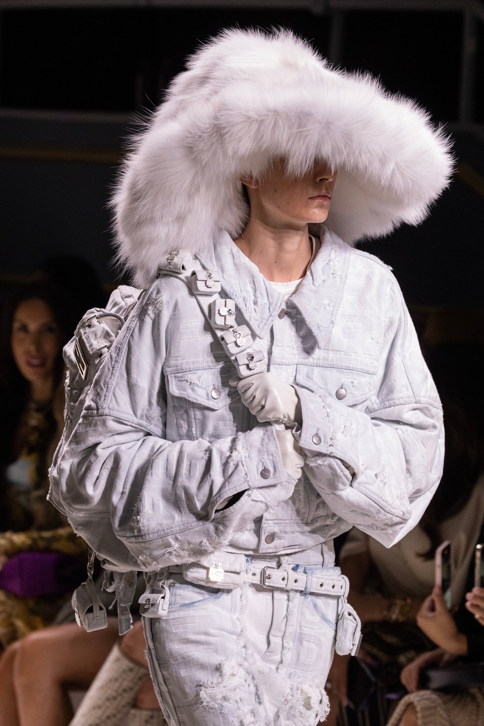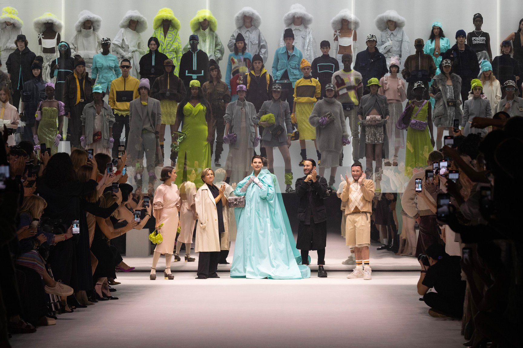 マーク?ジェイコブスは、長年の交友関係にあるキム?ジョーンズやフェンディのアイコニックなアイテムである「バゲット」と、バゲットを誕生させたメゾンに対する敬意をコレクションで表現したという。コレクションでは、パラシュートトレーンスカート、バルーンバックのブロークンデニムジャケット、セロファンのオペラケープ蛍光色のリサイクルファーのストールやハットなどを用意。ラインストーンやシルバー、蛍光イエローは、ニューヨークの路上で散見されるガラス張りの建物や、作業員の安全ベストから着想を得たという。