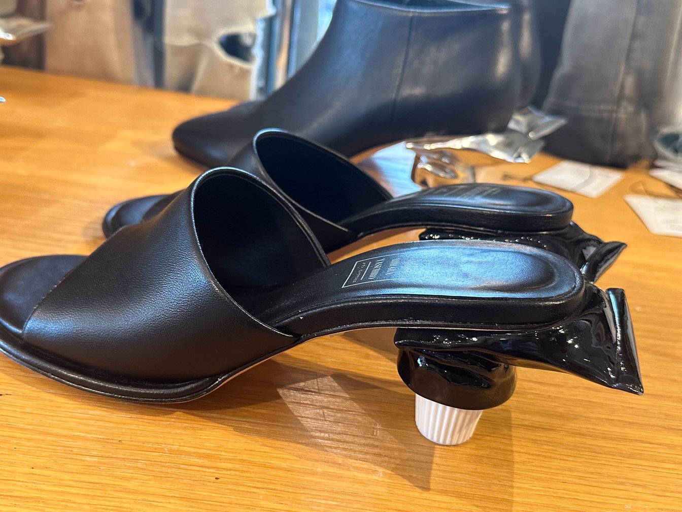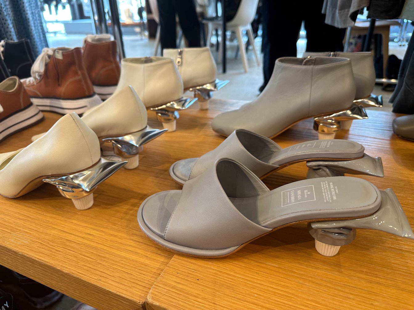 このほか、コレクションテーマとは独立して「日常の中に面白いものを」という想いのもと展開しているシューズからは、ヒールが歯磨き粉のチューブの形をした新作が登場。ブーツ(4万9500円)、パンプス(4万4000円)、サンダル(4万1800円/全て税込)の3型を揃え、ホワイト、グレー、ブラック、ブルーの4色を展開する。