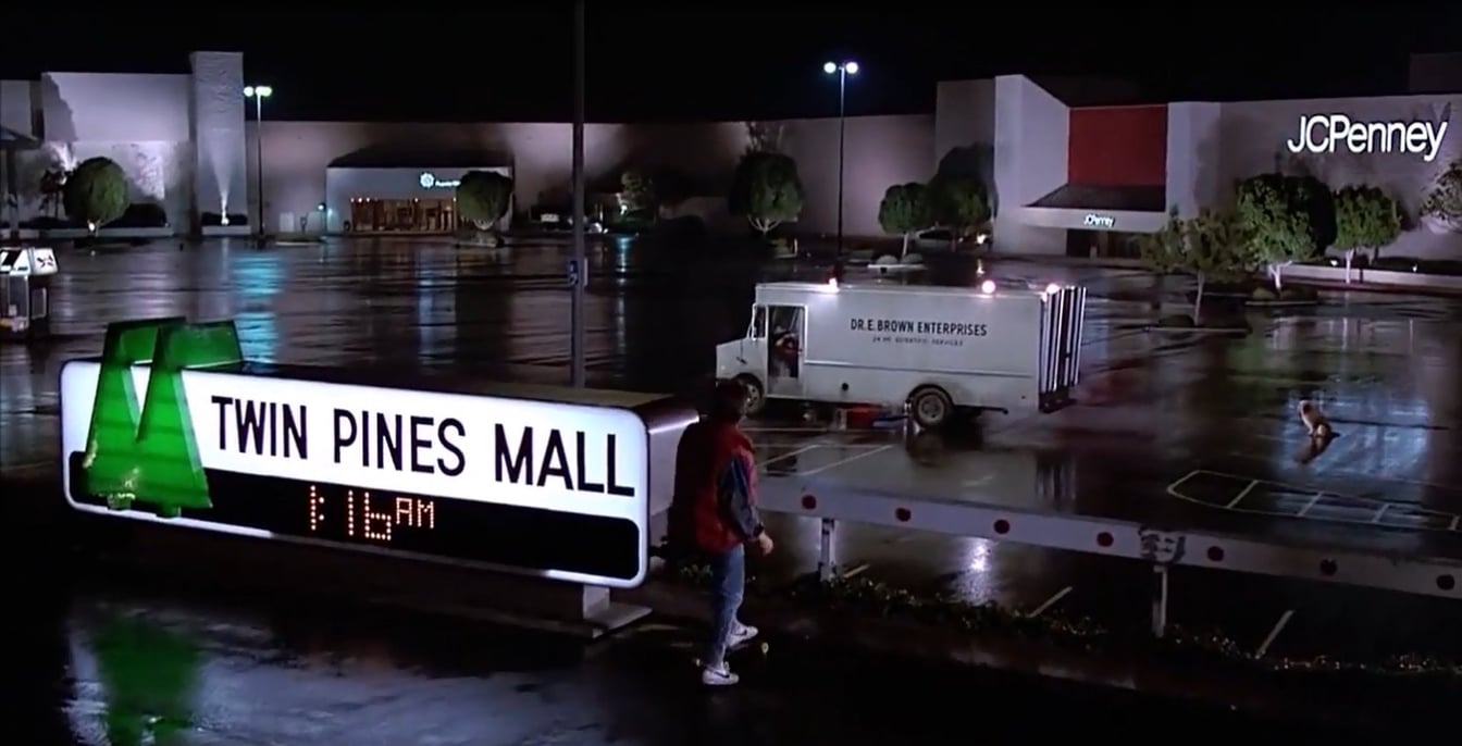 主人公のマーティ?マクフライが過去から戻ってきて「ローン?パイン?モール(Loan Pine Mall)」になったモール駐車場でドクを助けようとするシーンでもある。