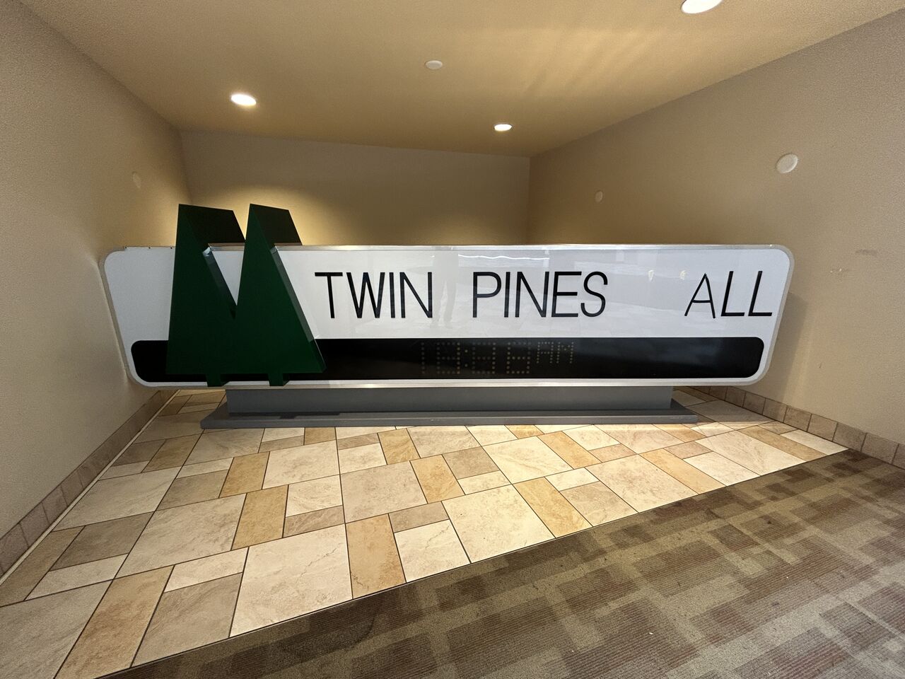 プエンテヒルズモールの中にツイン?ピークス?モールの看板のレプリカが飾っている。Mの文字が剥がれているが。
