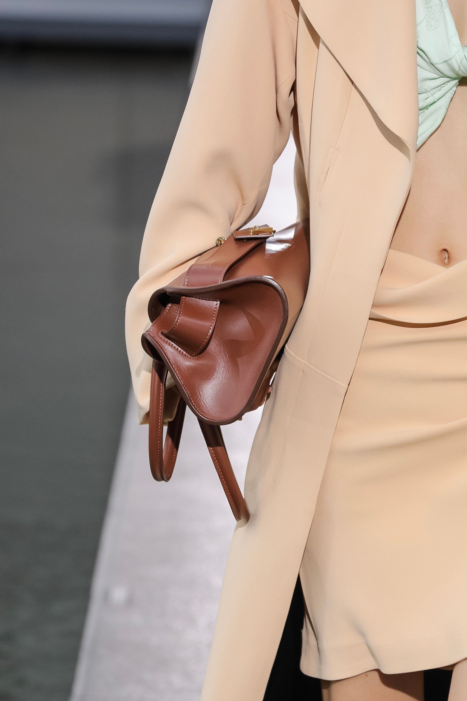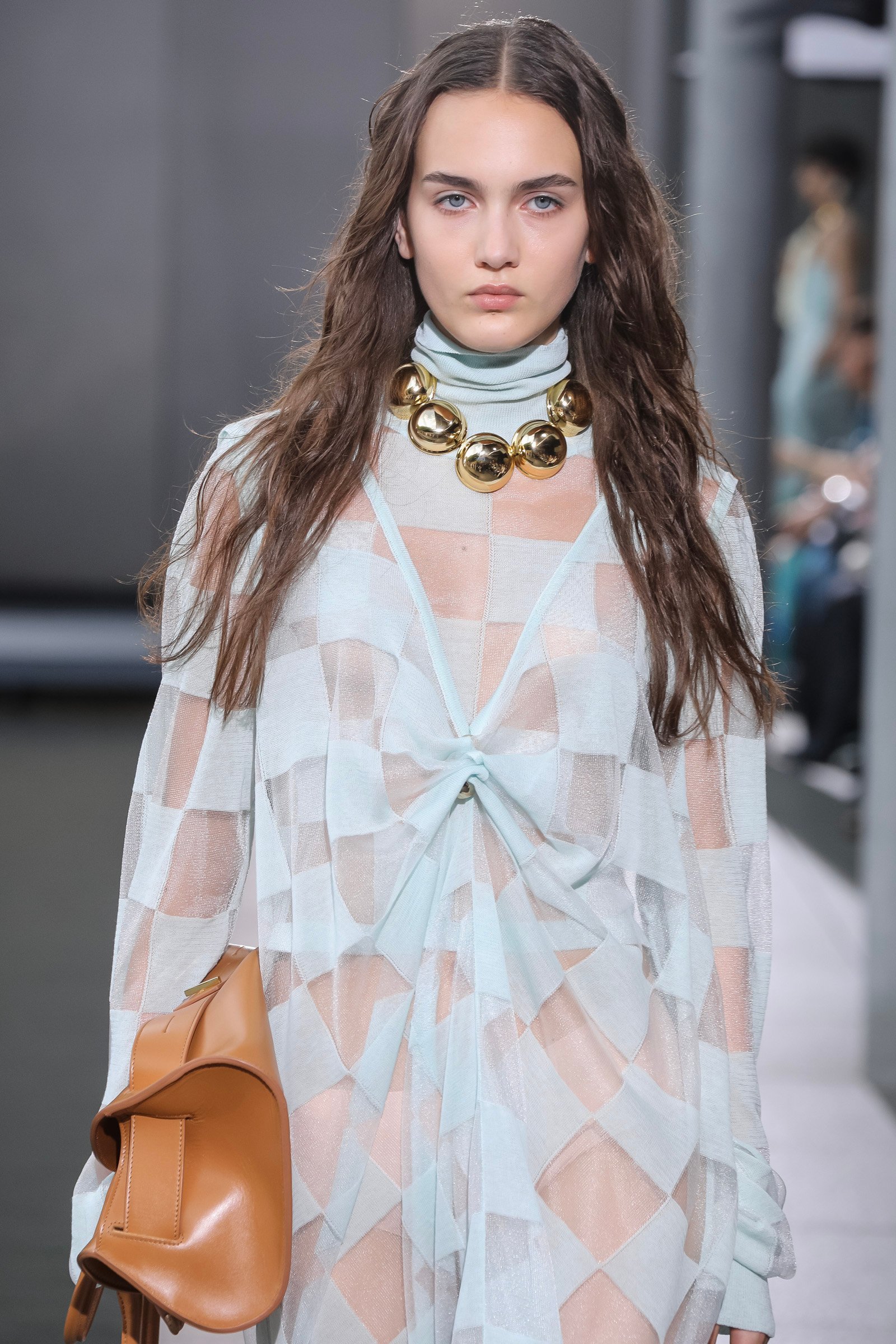 会場となったエントランスの水盤には、海の水面に照りつける太陽を思わせる照明が浮かび、軽やかなクラシック音楽とともにショーがスタート。冒頭、2022-23年秋冬コレクションのショーではインラインのアイテムを使用していた「オーエーオー(OAO)」との初のコラボレーションスニーカーが登場。ブラックのレザースニーカーには、アイコニックなゴールドプレートのモチーフをあしらい、ジャージー素材の白のショートドレスと組み合わせたことで、軽やかさを演出した。また、夕日を思わせる色鮮やかなグラデーションを施したワンピースや、爽やかなブルーのコットンブラウス、シアーなチェックのニット、美しいグラデーションに染められたシルクのドレスなども登場。小物には、大ぶりなゴールドのアクセサリーやブランドのアイコンバッグ「ピアーダ(PIADA)」などを組み合わせた。