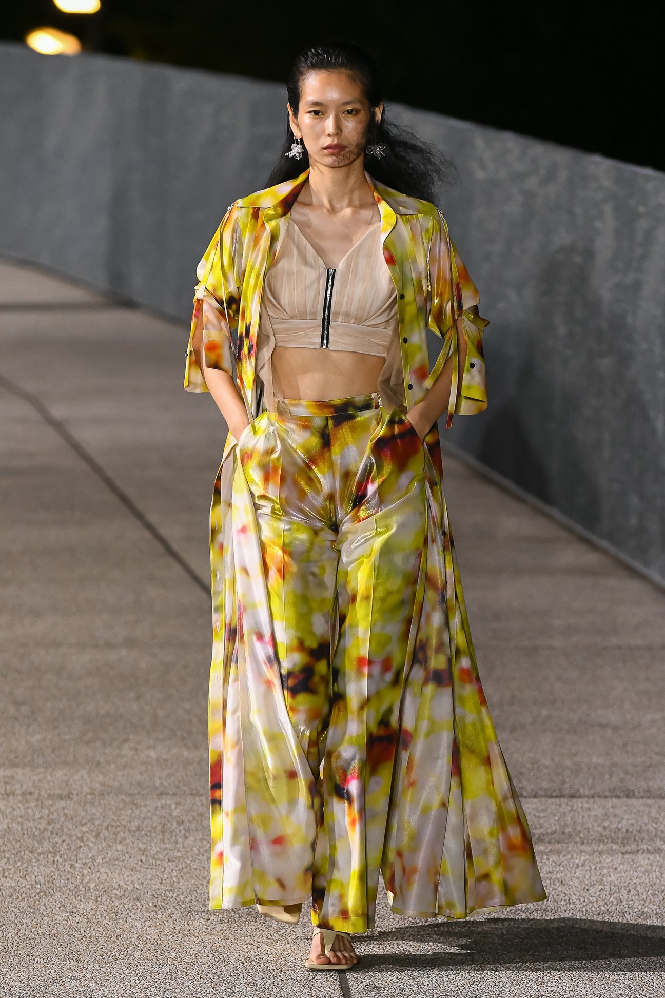 また新たなアプローチとして、アイスダイという染色加工とゴム糸を使用した刺繍加工を採用。アイスダイは、氷に染料をかけ、溶かしながら染色する手法で、「滲み」や「霞み」といった独特の色味で「夢」の世界観を表現したという。ワンピースやシャツ、ドレスなどのアイテムに、黄色や赤、青、紫、緑、白といった様々なカラーを染色した。また、新たな刺繍加工を加えたルックとして、ゴム糸を使用したドレスが登場。表糸にはレーヨン刺繍糸、裏糸にゴム糸を入れ縮ませることで立体感を演出した。2022年秋冬で採用した収縮刺繍は、土台布と収縮布を何層も重ねてボリュームをプラスしていたが、今回は布一枚で立体感を演出したため軽量性も兼ね備えた。