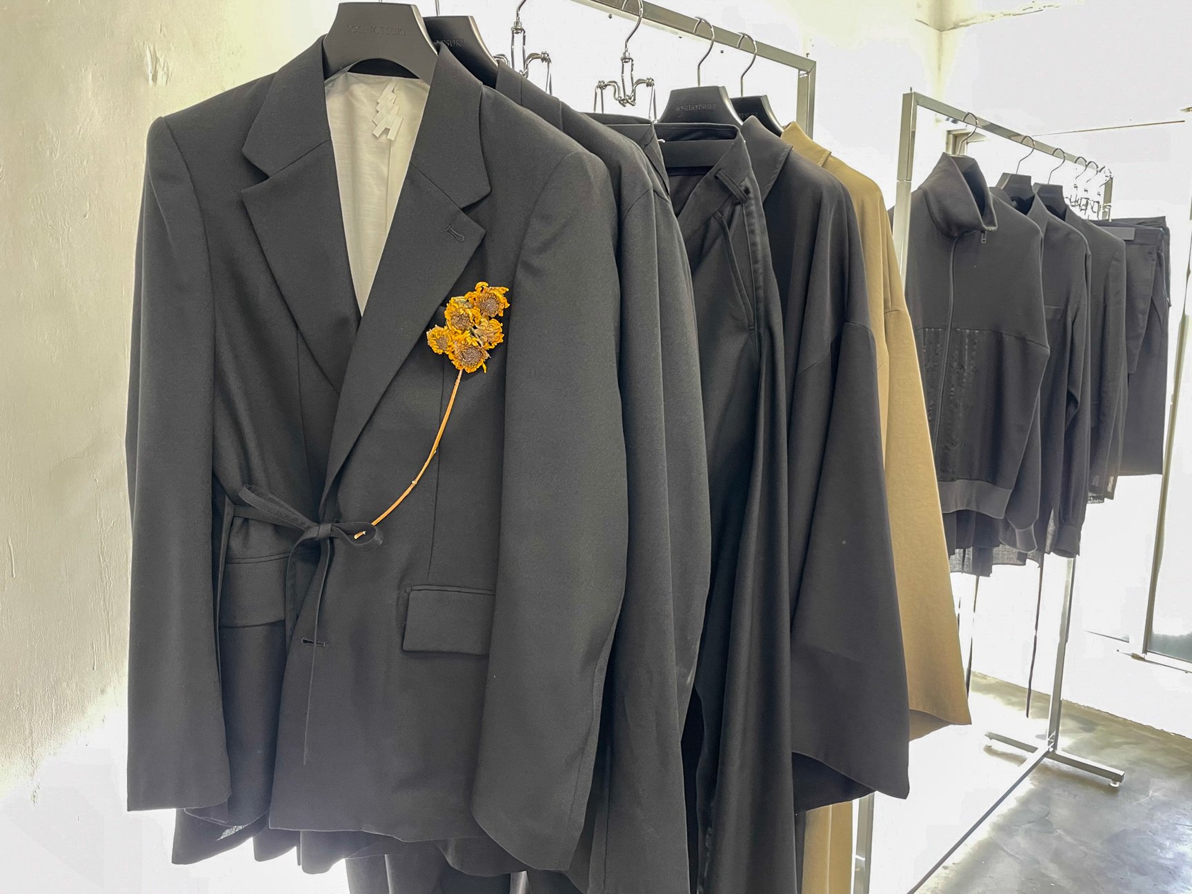 コレクションでは、定番のキモノブレステッドシャツに、華道家の小春丸が活けた、満開から枯れ果てるまでの様々な向日葵をフロントにプリントしたアイテム(4万5000円)など、向日葵のデザインをあしらったアイテムを数多く展開。「漠然と花=女性らしいという偏見を持っていたが、今回の目標を考えればとにかく花をコレクションに入れたいと思った」とその経緯を説明し、向日葵について「向日葵は大きく、同じ方向を向き、中心もよくみるとグロテスクであるため子どもの頃から恐怖心を抱いていた」と語った。大月の「男らしいに捉われない」という目標は、花のモチーフ以外にデザインとしても表現されており、雨振袖と呼は?れるナホ?リの伝統的な袖付けの技法を使った製品染のシ?ャケットは、キ?ャサ?ー分量を多くすることで、男らしいとも女らしいとも取れる絶妙な形にアップデート。スクエアネックのニットシリーズは天幅を調整することによって、婦人服の定番であるスクエアネックに紳士服らしさを加えるなど、紳士服の定番のように見えるアイテムを少しつ?つす?らすことによって微妙な違和感をコレクション全体に与えたという。