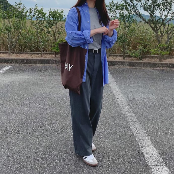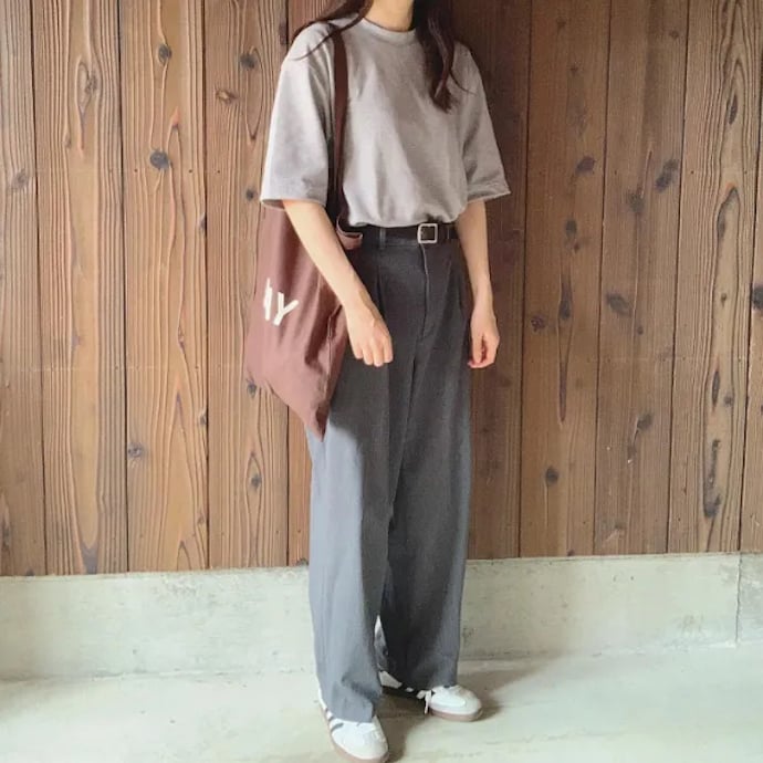トップスとボトムスの色味を統一すると、よりいっそうトートバッグが際立って、コーディネートの主役にできそうです。