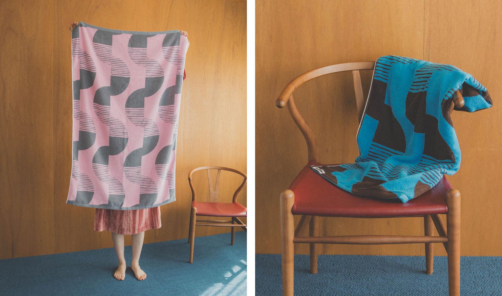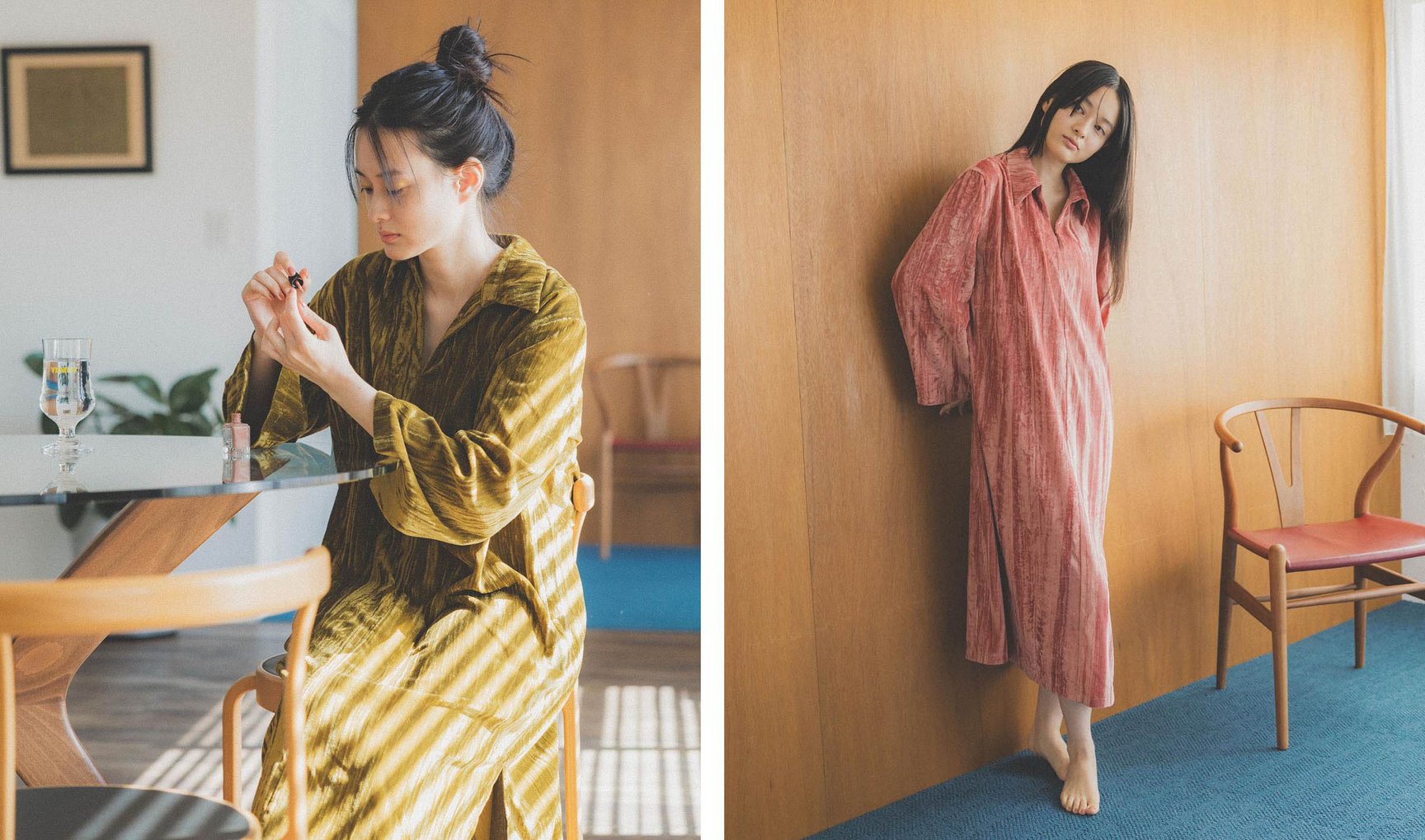ファーストコレクションでは、ワンマイルウェアのセットアップ(2色展開、各1万8700円)とワンピース(2色展開、各1万5400円)に加え、ブランケットとしても使用できる大判のバスタオル(2色展開、各9900円)、ブランドロゴ入りのドリンクグラス(4950円)、収納としても使用できる大型のマチ付きトートバッグ(2色展開、各4400円/全て税込)の計5型を揃える。