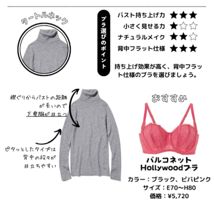 例えば、タートルネックセーターを着用する場合、襟ぐりからバストにかけたデコルテ部分の間延び感が目立ちやすいため、持ち上げ効果の高いブラジャーの着用がオススメ。