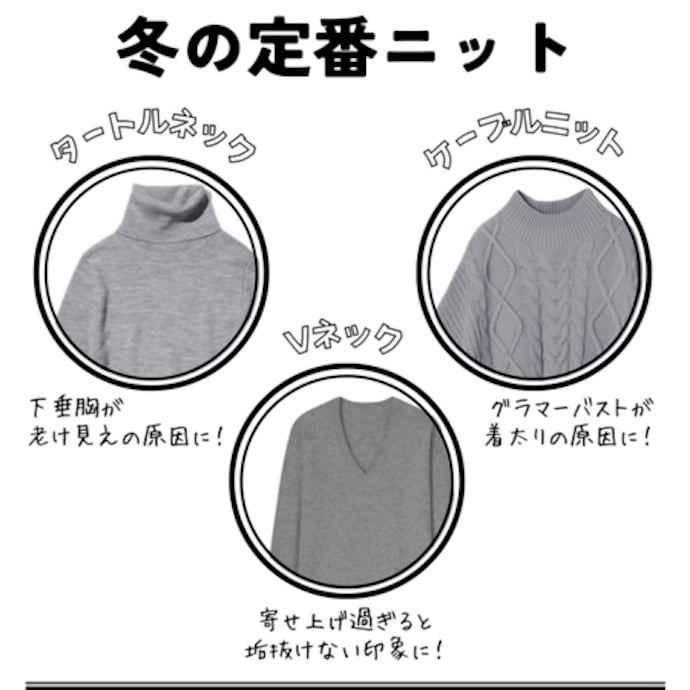 他にも、体が薄く華奢な骨格ウェーブタイプがフワフワとしたニットを着用すると“華やかさが増して好感度アップ”に繋がることがあるが、同じニットを骨格ストレートタイプが着用すると“体の厚みが助長され、着膨れしたマイナスの印象になってしまう”など、骨格に合わせてニットのデザインや素材を選ぶアドバイスも紹介されている。