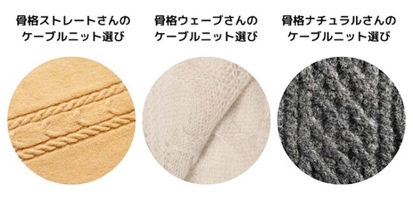 特にケーブルニットは模様によって厚みや形状、着用したときの印象が大きく異なり、骨格タイプとの相性の良し悪しが顕著に出てしまうため、ブラジャー選びだけでなく骨格タイプに合わせてニットのデザインや素材を選ぶことも重要だそう。