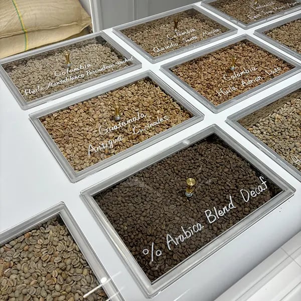 天井からは「%」のネオンが吊り下げられており、コーヒーの麻袋がずらっと並べられています。