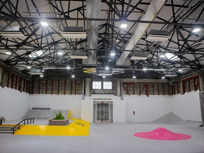 スケートパークには、大会やイベントなどが開催できる「メインスケートパークエリア」や「サーフバンクNEWセクション」、「ミニランプ?ミニボールエリア」、小学校中学年までの子どもが利用できる「KIDSアスレチック&トランポリンエリア」を設置し、スケートボーダー以外の来場者も利用できる多目的アクションスポーツフィールドして展開。メインスケートパークエリアは冷暖房を完備し、初心者でも安心して滑れるフラットスペースも備えるなど、さまざまなスケートボーダーが利用できる環境を整える。