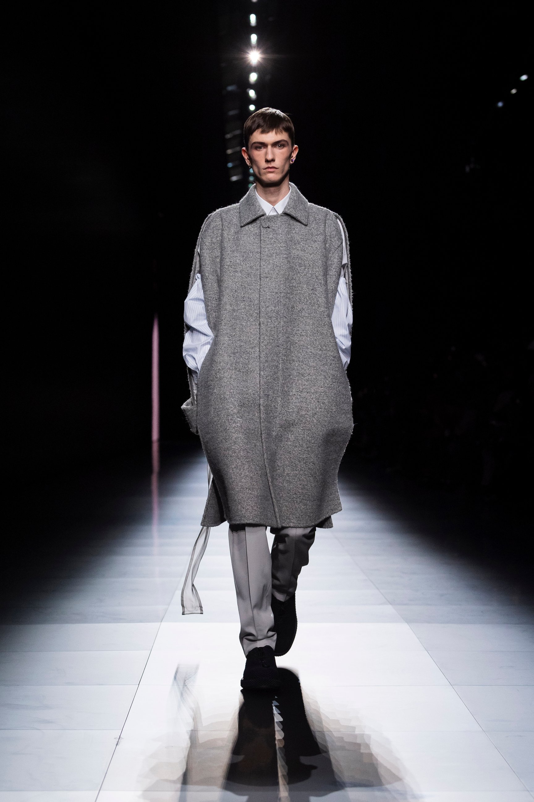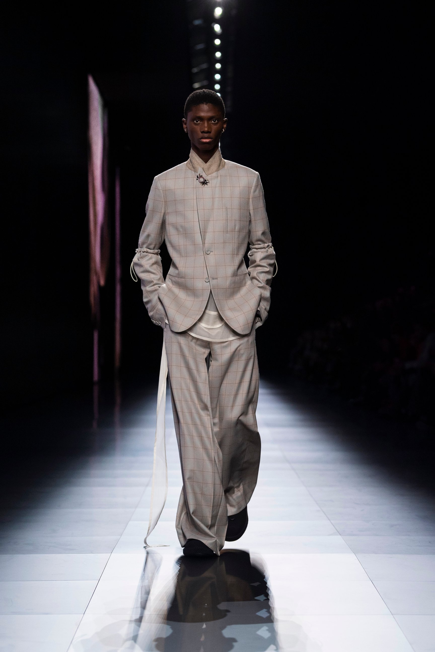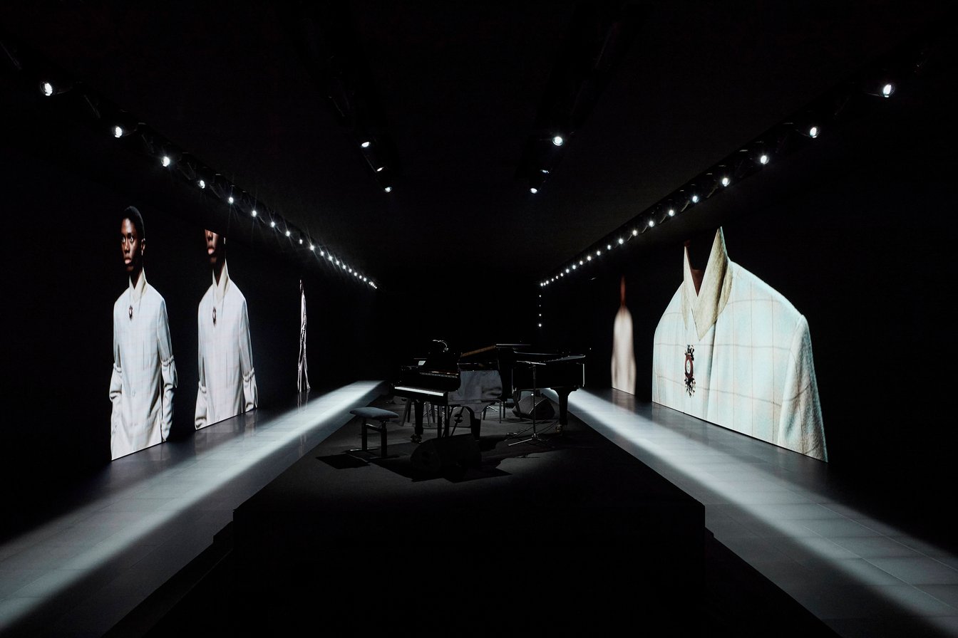 スクリーンとランウェイは、中央のグランドピアノを挟むように両側に設置された。その不思議な構図はロンドンのテムズ川とパリのセーヌ川を意味しており、英国人であるメンズ クリエイティブ ディレクターのキムと、フレンチメゾンのディオールの関係性をも示唆する。今回のテーマは「変化、躍動、気楽さ、流動性」。水の流れとファッションの世界を重ね合わせ、朗読された「荒地」の中でも、古代の風景が現代の都市景観と共に広がり、時代が錯綜していく。