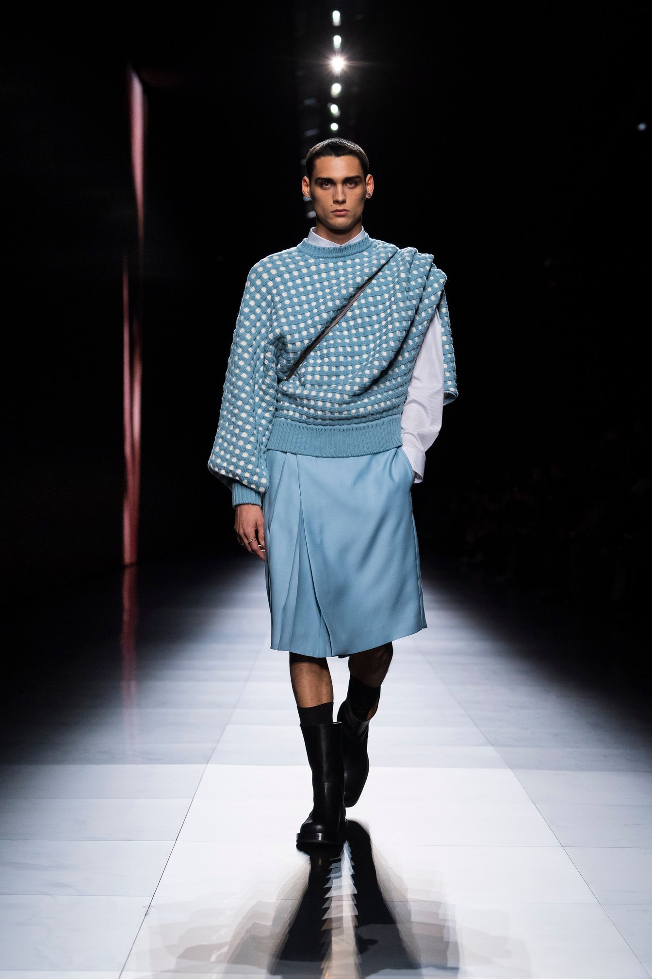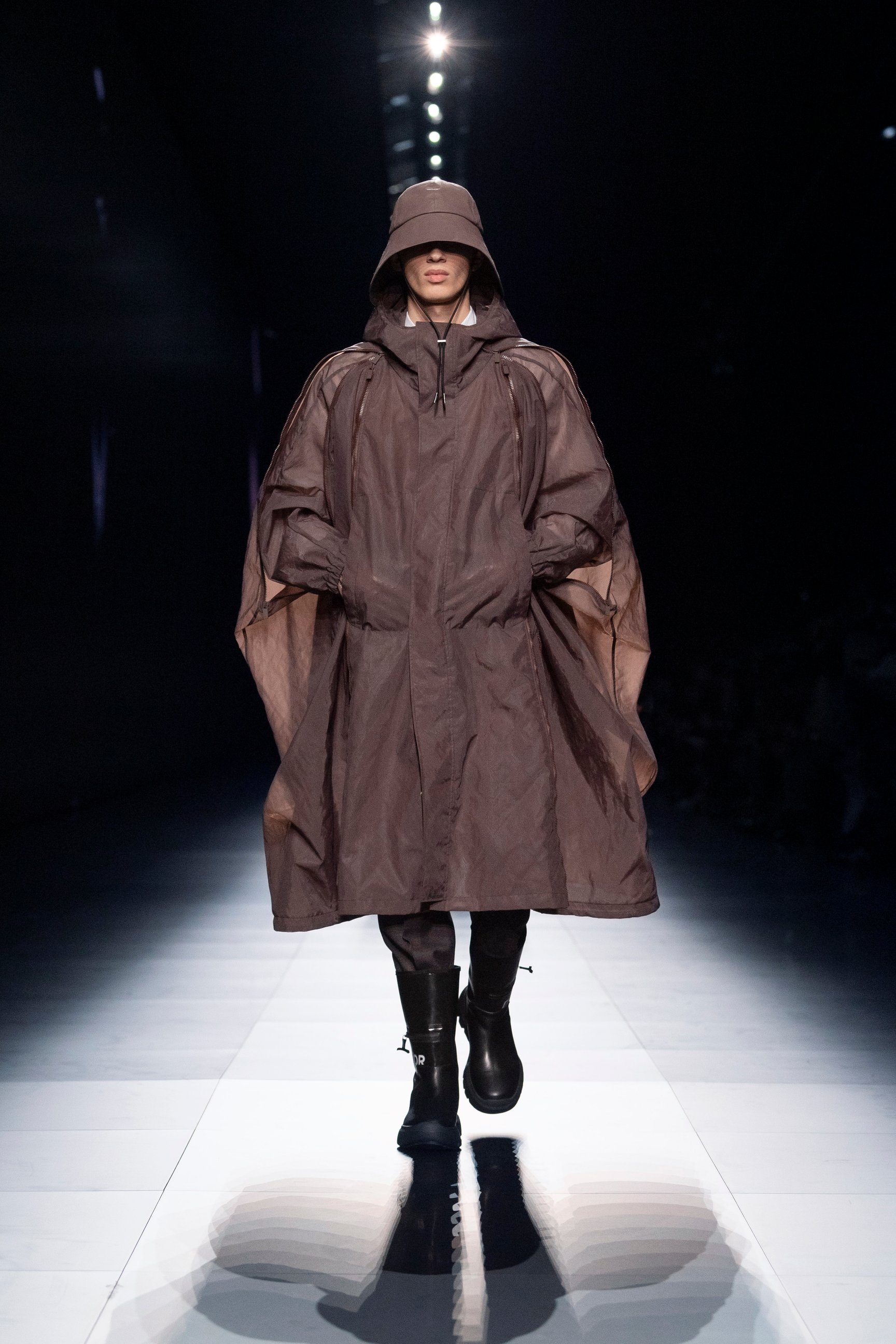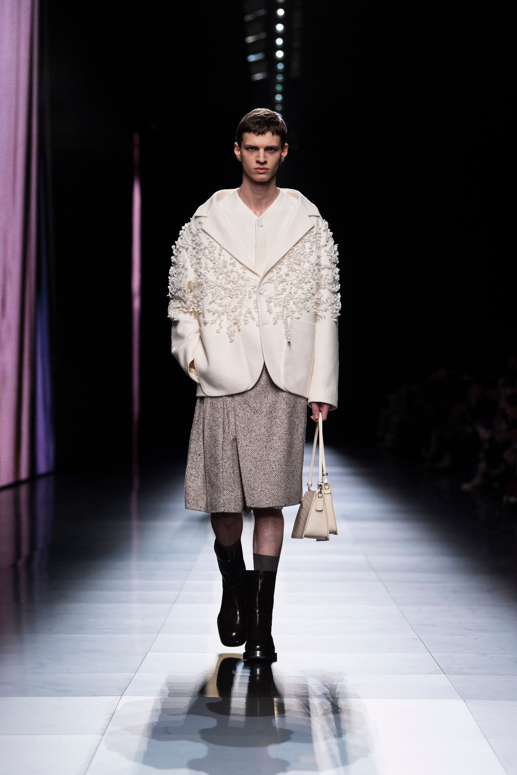 スクリーンとランウェイは、中央のグランドピアノを挟むように両側に設置された。その不思議な構図はロンドンのテムズ川とパリのセーヌ川を意味しており、英国人であるメンズ クリエイティブ ディレクターのキムと、フレンチメゾンのディオールの関係性をも示唆する。今回のテーマは「変化、躍動、気楽さ、流動性」。水の流れとファッションの世界を重ね合わせ、朗読された「荒地」の中でも、古代の風景が現代の都市景観と共に広がり、時代が錯綜していく。