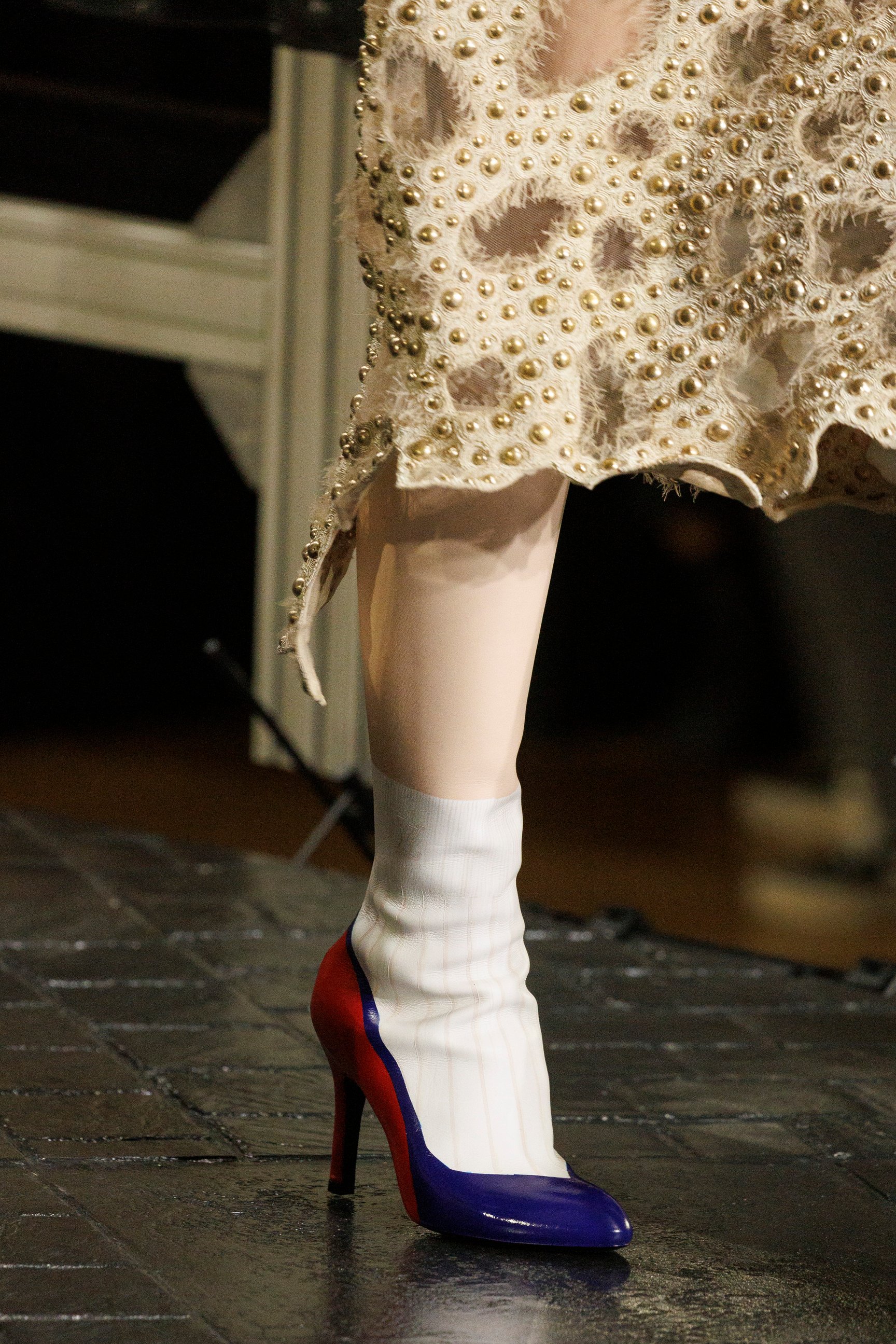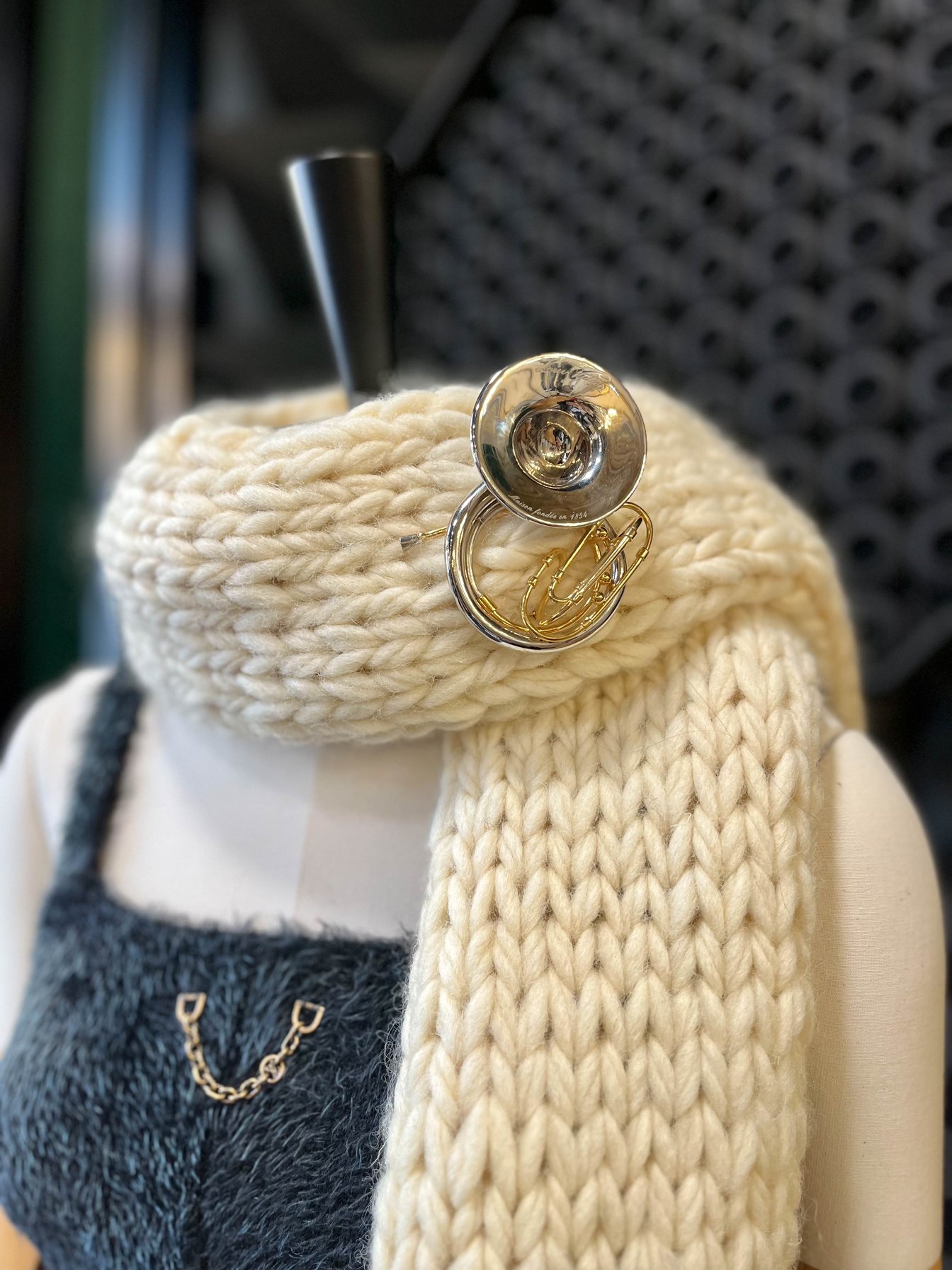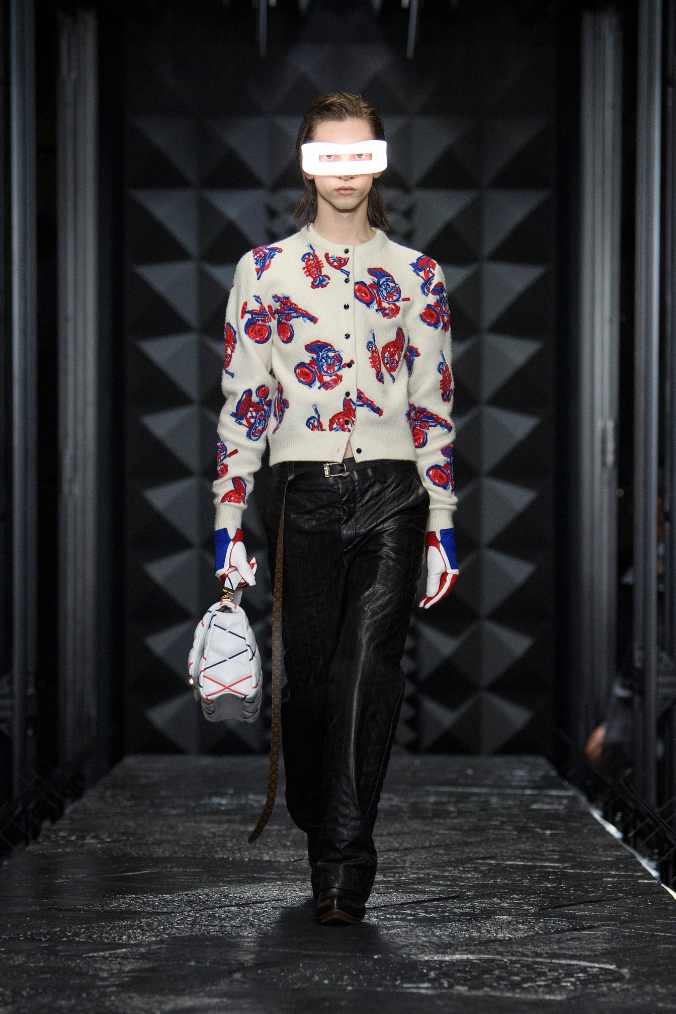 彫刻のようなフォルムのドレスや、ソックスとパンプスを履いているように見えるトロンプ?ルイユのブーツなど、アーティスティックかつ意味深なアイテムも登場。ホルンやトランペットといった管楽器を模ったブローチや、白く発光するSF風マスクはシュルレアリスムを思わせる。長すぎる襟やマフラー、膝下まで垂れ下がるベルトなど、比率を再解釈したディテールは2023年春夏コレクションのエレメントを彷彿とさせた。