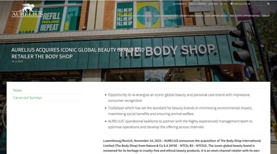 なお2023年11月にドイツに本社を置く投資グループ アウレリウス(AURELIUS)がザボディショップを買収すると発表している。