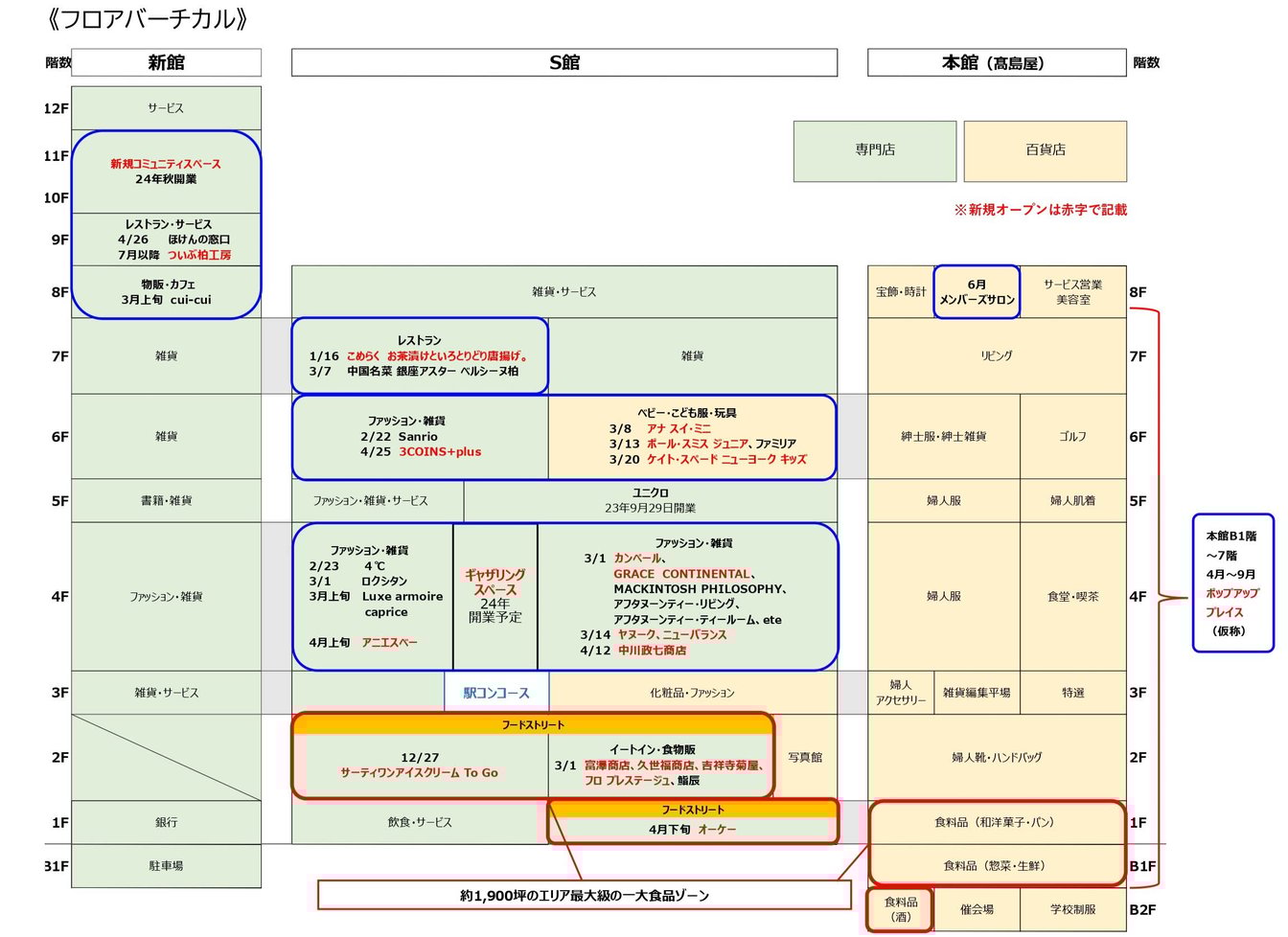 本館高島屋は、地下1階から地上7階までの各フロアにイベントスペース 「ポップアッププレイス(仮称)」を4月以降に新設し、期間限定ショップやイベントなど開催していくという。8階のメンバーズサロン(6月リニューアルオープン)は既存の約3倍の面積に拡大し、全面改装を実施。このほか、新館10、11階では2024年秋に、様々な形態のレンタルスペースやオープンスペース、千葉県初出店となる「シェアラウンジ(SHARE LOUNGE)」を含んだコミュニティスペースを開設する予定だ。