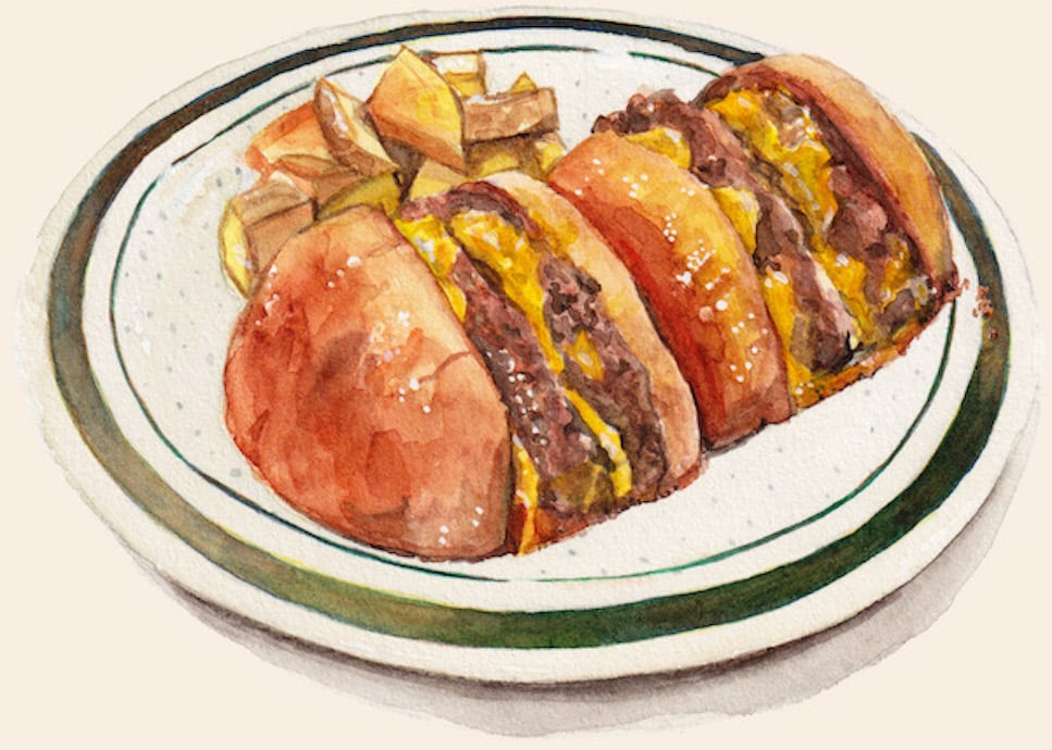 ハンバーガーを縦に切り、その断面を熱々の鉄板で二度焼きすることで、パティや具材に肉汁をしっかりと吸わせる逸品だ。