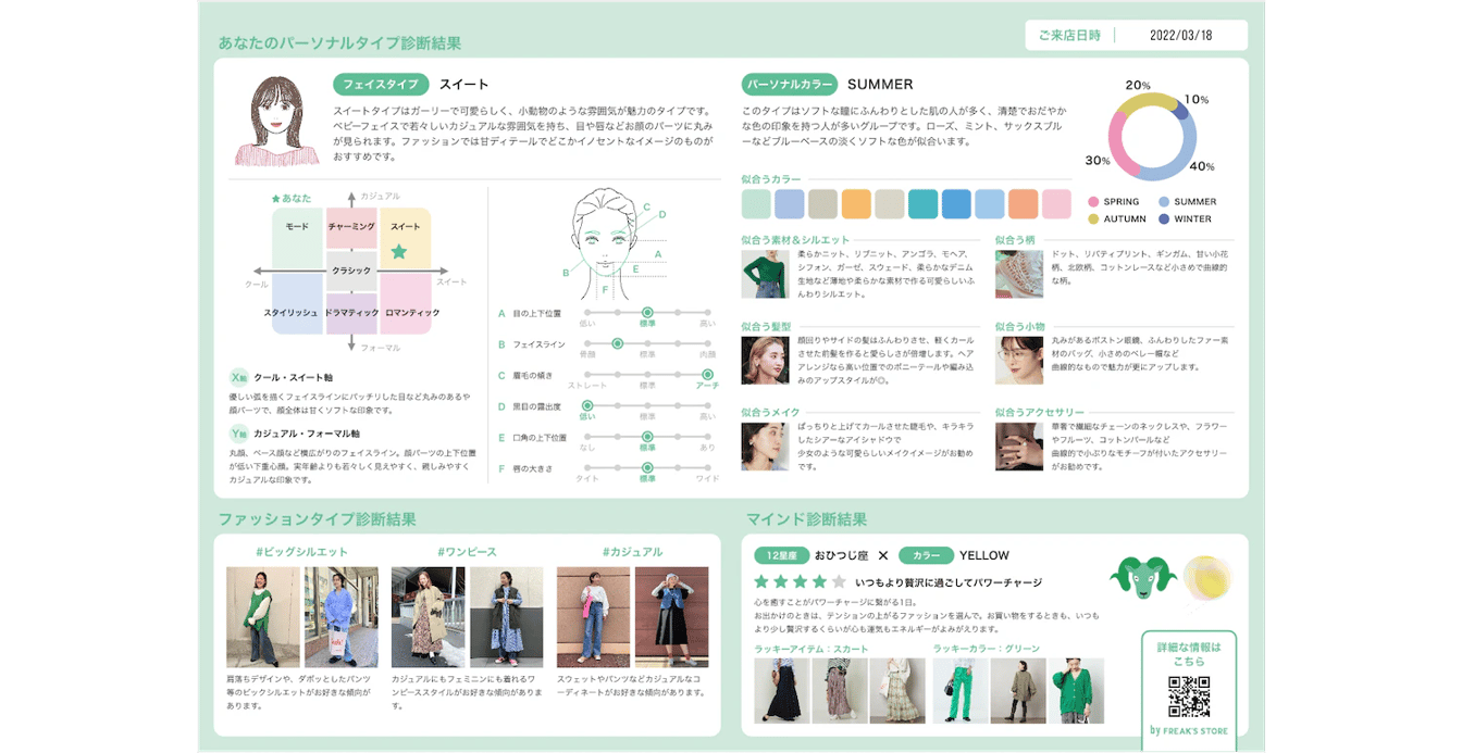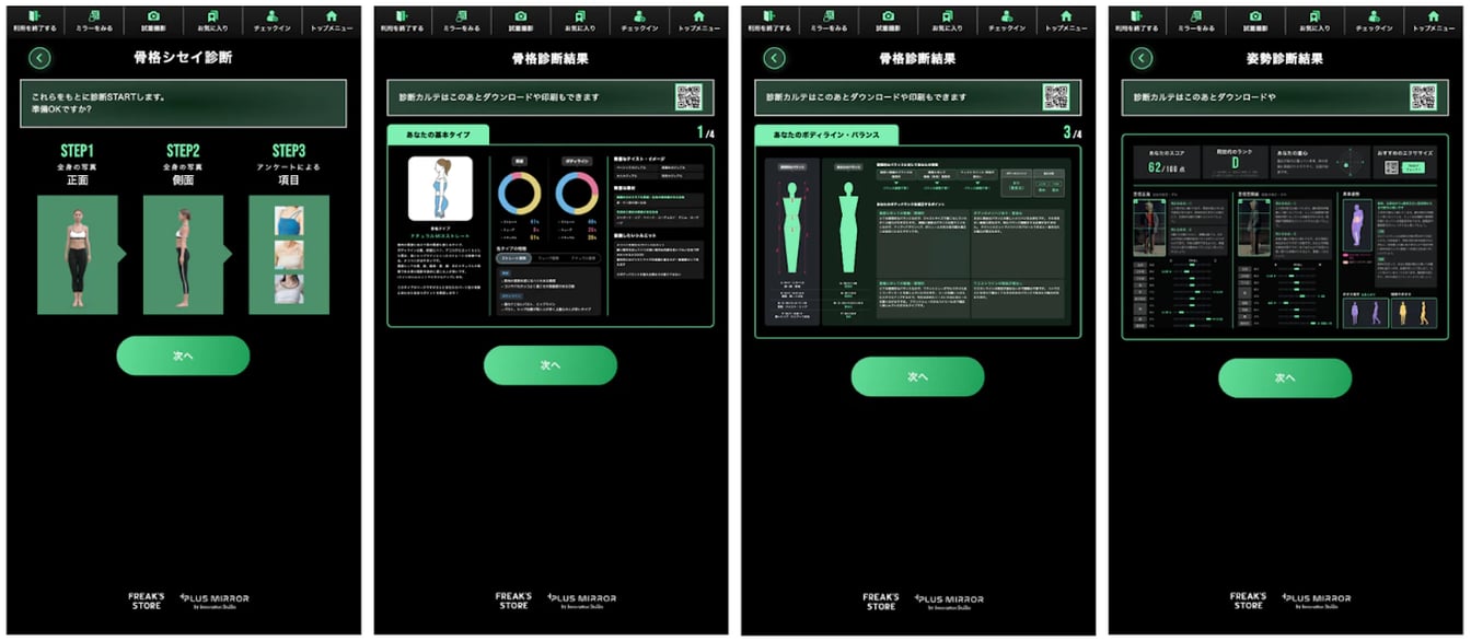 最近では新たに『骨格シセイ診断』機能をリリースしました。一般的には3分類の骨格診断が多いですが、より詳細12タイプに分類にし、さらに一人ひとりの体の特徴に合わせて100人いたら100通りの結果が出てくる超パーソナライズされた診断機能です。パーツごとの特徴やお客様のボディバランスに合わせた着こなしの提案があり、かなり見応えのある内容になっています。