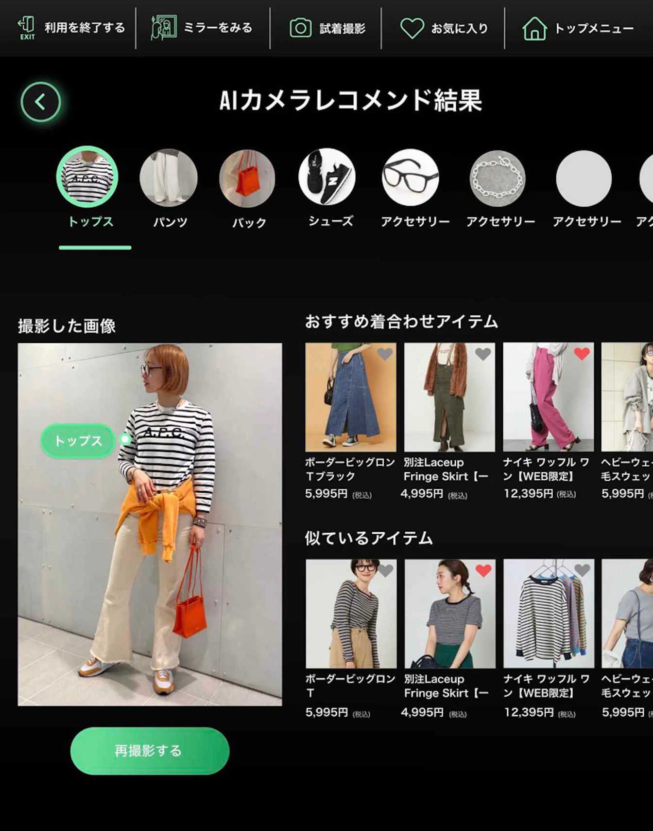 まずは、商品タグのスキャンやAIカメラによるコーディネートアイテムの識別について。これはAIカメラで撮影することで、着用アイテムをAIが瞬時に判定し、おすすめのコーディネートを提案してくれる機能だ。