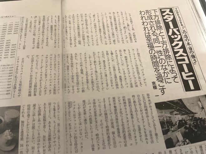 名高いフラペチーノ実験の頃のサンタモニカ各店で私は不思議なことに気がついた。同じ時に同じ人がいつも集まる。ちょうどパブやバーと同じように。ある人は新聞を読み、ある人は原稿を書く。お互いがお互いを認識しあっているのはわかるが、滅多に話し声は聞こえない。別々な時間の過ごしかたにもかかわらず感じられる、強烈な連帯感、同一性。滞店時間2分のテイクアウト客にすらそれがある。(『月刊食堂』、1998年9月号)