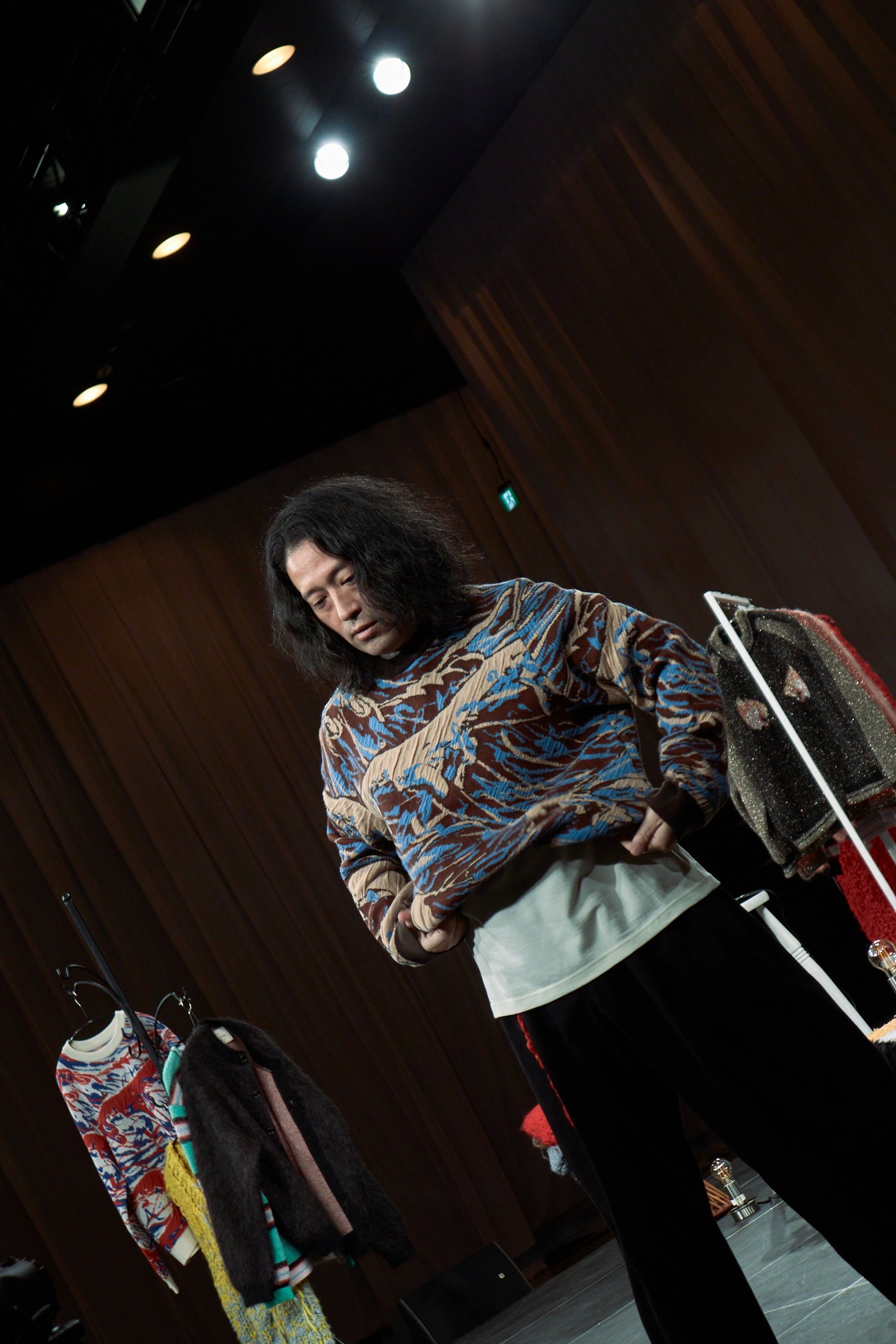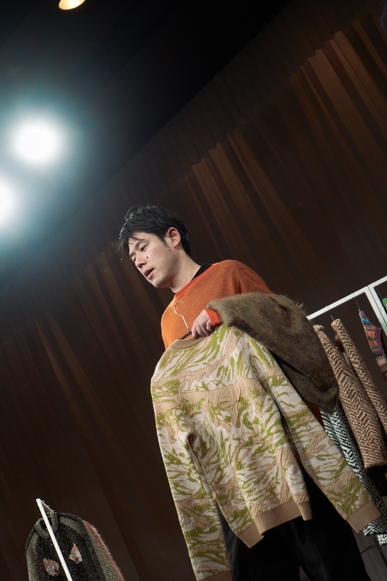 最後には、Kota Gushikenのルック画像を使ったスライドネタを披露し、Kota Gushikenではないニットウェアを映した写真もアイロニカルに、でも笑いにかわるほどの温かさがそこには漂う異様な光景がつくり出されていた。みんながKota Gushikenのブランドそのもの、ニットウェアに愛を感じていたのだと思う。