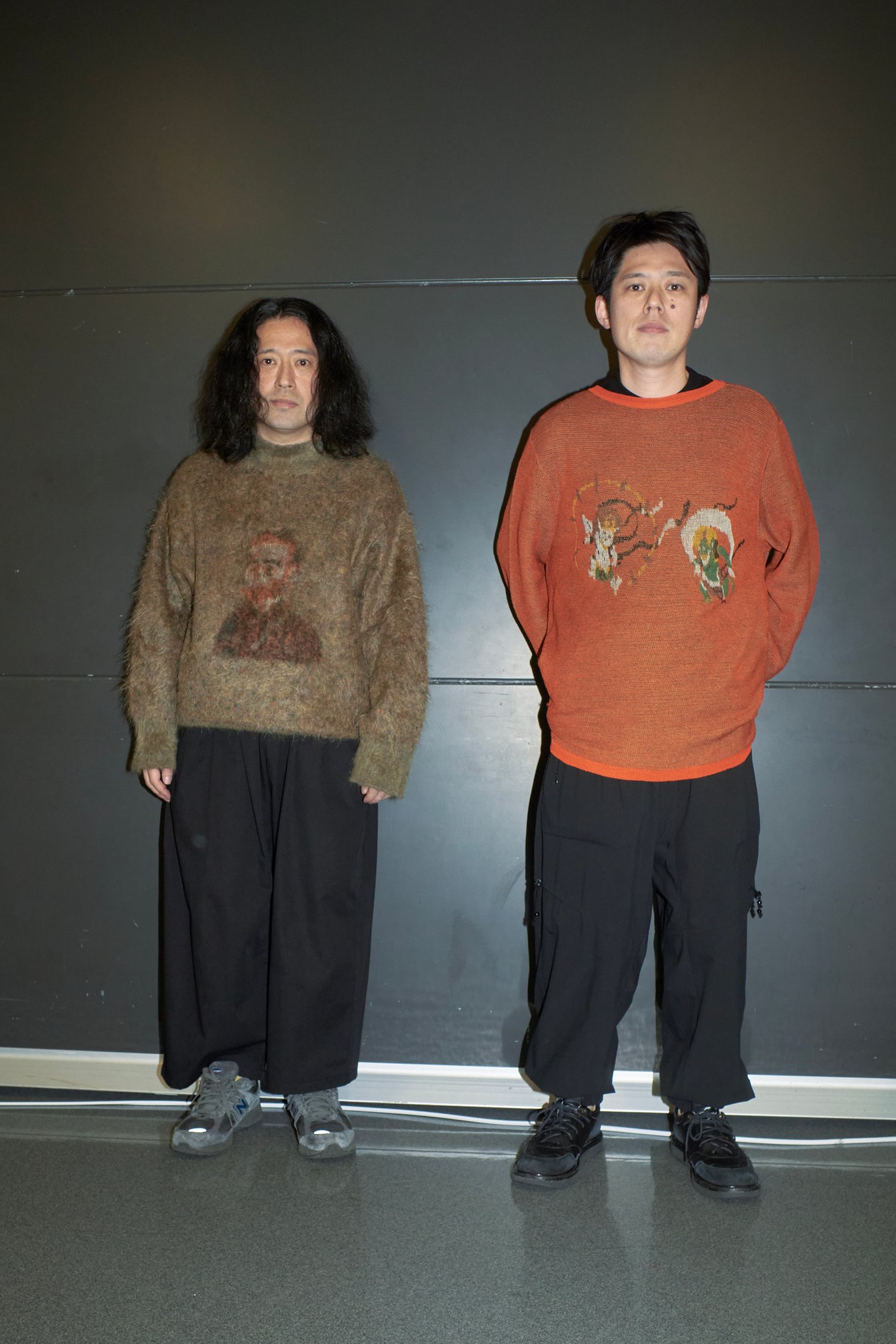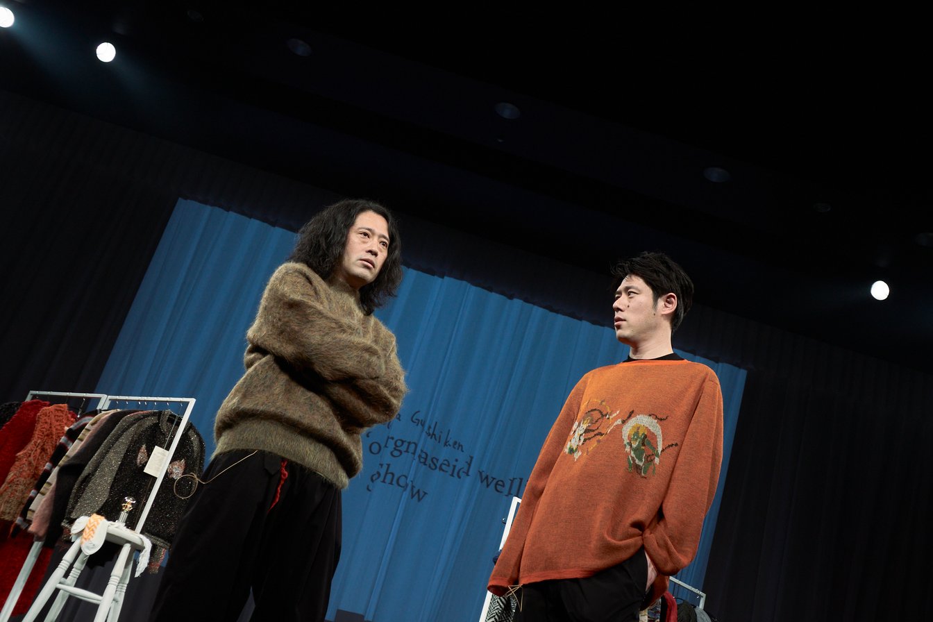 観客から少し見上げた位置にセットされた舞台の背景には、「orgnaseid well」という注意深く見ないと分からない程度のスペルミスのコレクションタイトル。ラックにかかったニットウェアに囲まれながら、プレゼンテーション形式で左から右へとモデルが登場する中で、コレクションが徐々に整理されていくのだと思っていた。しかしそんな自分の想像をはるかに裏切るように登場したのはお笑い芸人の又吉直樹氏(ピース)と好井まさお氏のふたりだった。