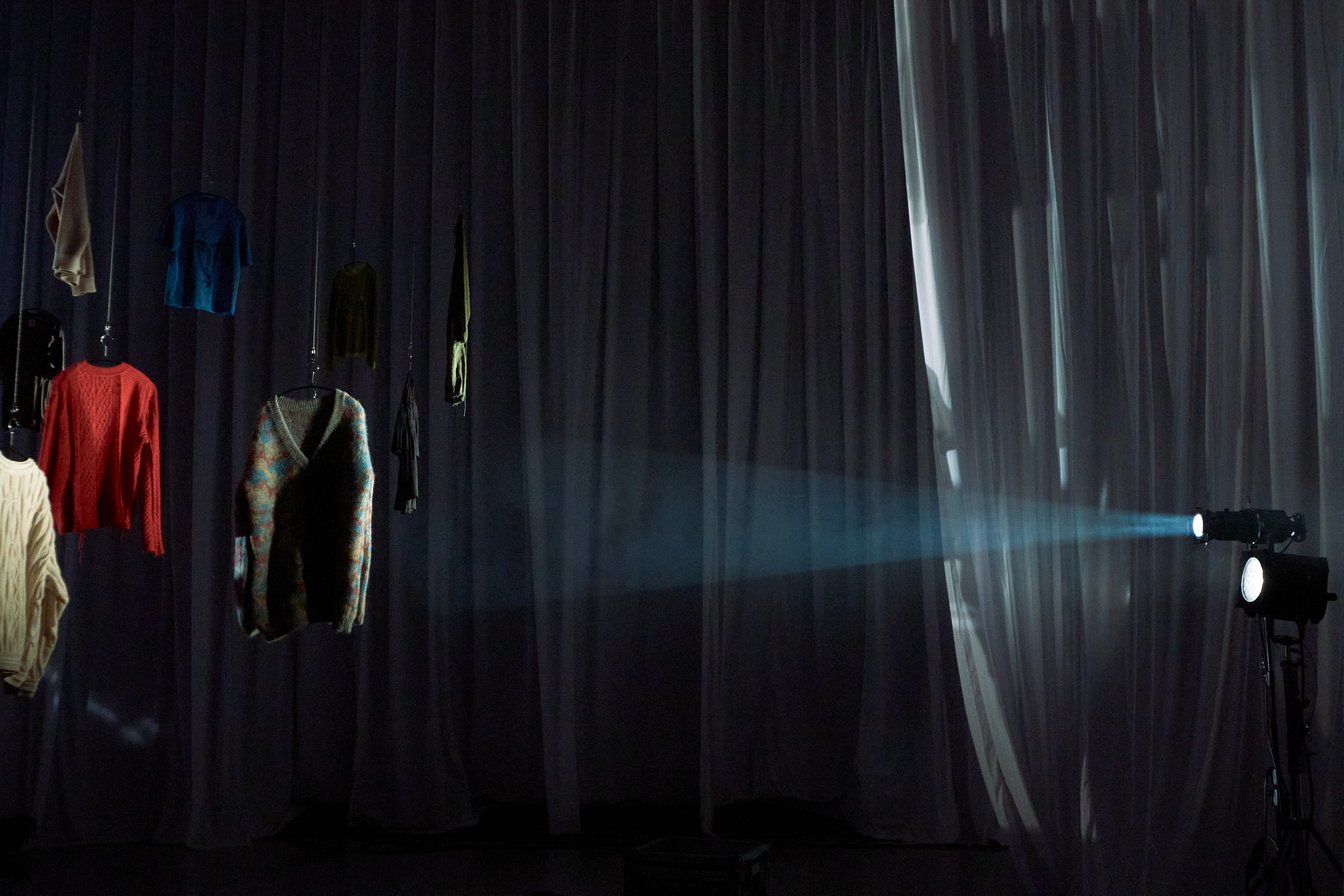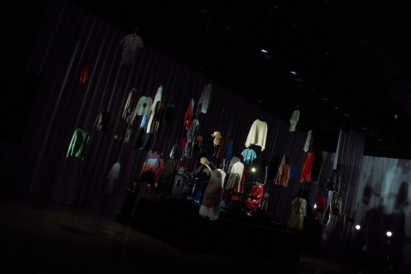 やや緊張気味のふたりが始めた、ショートコント「展示会」。Kota Gushikenの展示会に来た設定で、お互いのニットウェアを褒めあったり、ニットのスカジャンに驚きを感じたり、筒状になった赤色のニットワンピースでモノボケをしたり、Kota Gushikenがこれまでに向き合ってきたニットウェアの魅力を幾度となく彼らが伝えていくうちに、序盤の空気をみなが忘れるほどに会場の空気はどんどん軽くなっていくのを感じた。