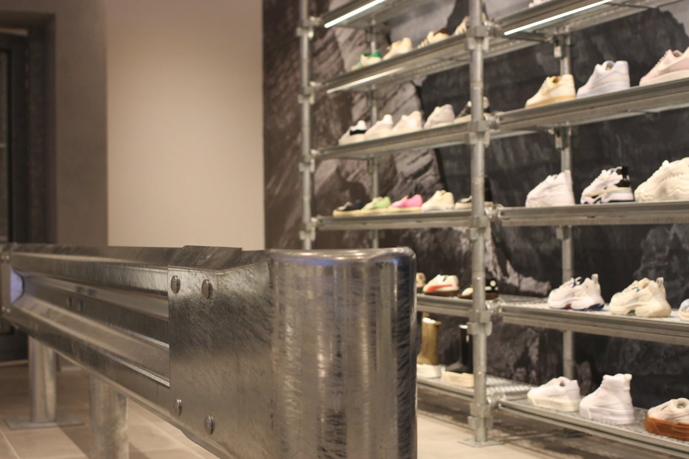 店内には大きなガードレールが設置される。極力、無機質に仕上げたという内装は、スニーカーのカラフルさがより引き立つようにという趣向だ