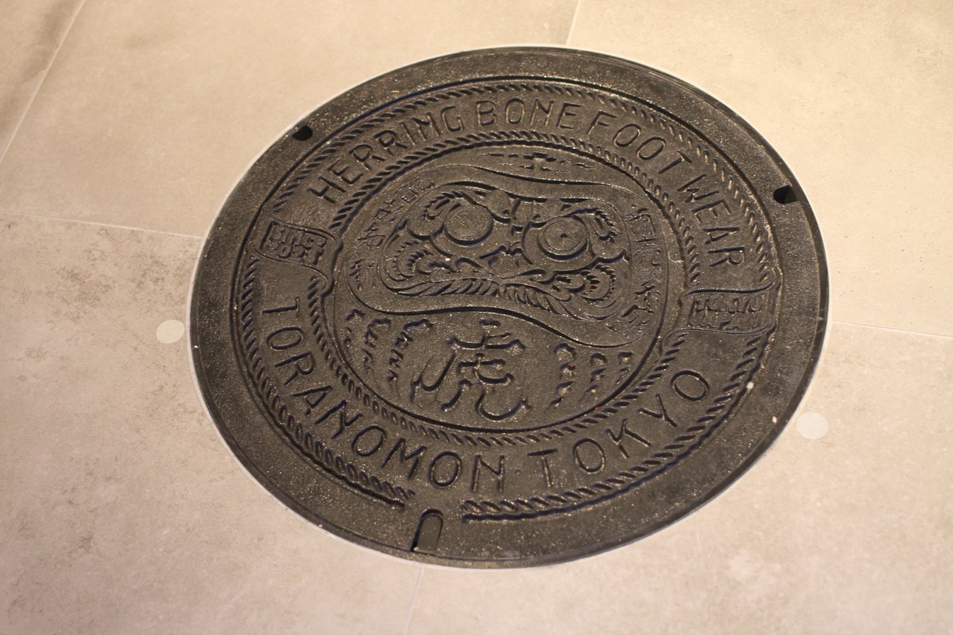 店内の床にはマンホールのような蓋もレイアウト。達磨のデザインと“HERRINGBONE FOOTWEAR”や“TORANOMON TOKYO”との刻印も