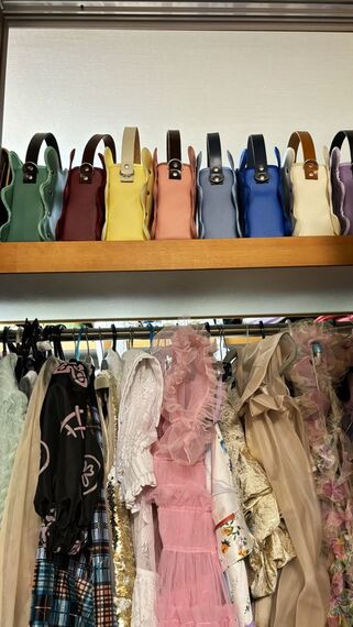 バッグブランド「ノリエノモト」のデザイナーで、レディスアパレルブランドのパタンナーも務めている。職業柄、クローゼットには自身の手掛けるバッグが多いが、ガーリーでデザイン性の高いドレスも100着ほど並んでいる。