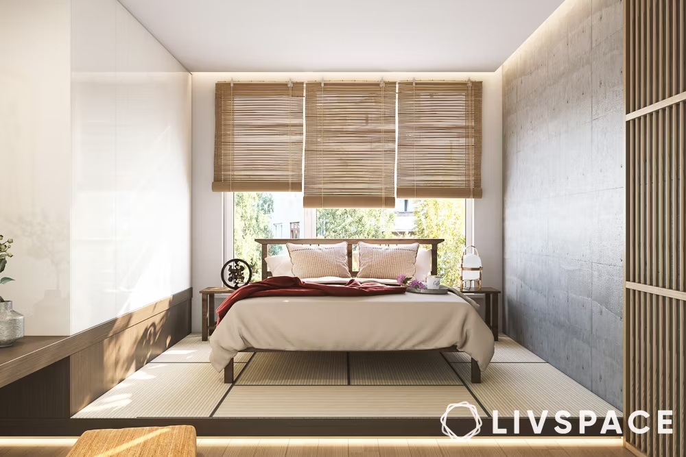 床には畳をしき、窓には竹製のブラインドを設置した和風のデザイン例。Image Credits:LivspaceImage Credits:Livspace