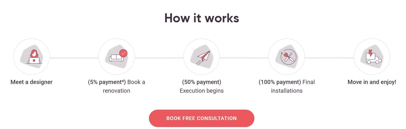 住宅リフォームを簡単に発注できることが特徴で、住居オーナーは5つのステップで理想の住居を手に入れることができる。デザイナー紹介→Livspaceを予約→発注→施工開始→引越し、といった具合だ。しかも、注文から45日以内の引き渡しと10年保証が約束されている。