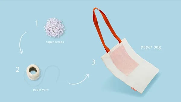 そこから再生紙を作り、その紙を糸にして布に織りあげ、バッグとして縫製するのだといいます。