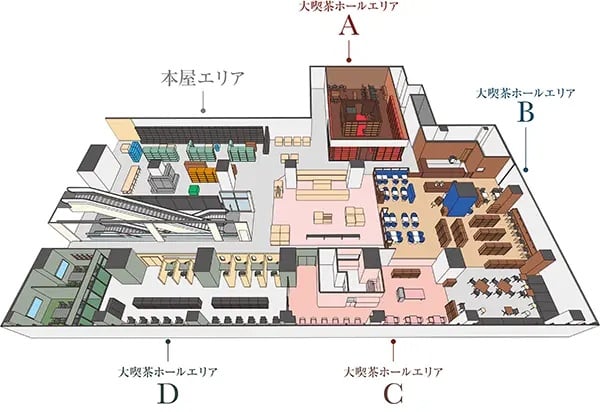 有料エリアである『大喫茶ホールエリア』は、4つのゾーンで構成。入場料(90分 税込825円?)を支払うことで利用できます。