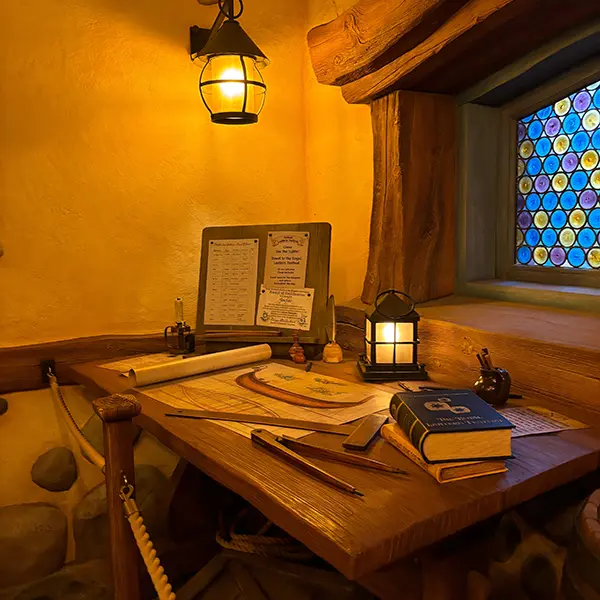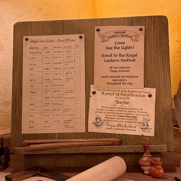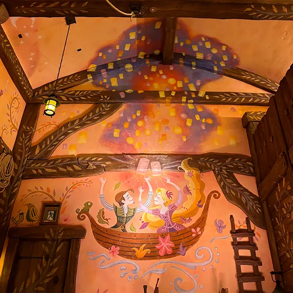 最後はボートハウスの作業場へ。壁一面にラプンツェルの絵が描かれており、その後のしあわせな生活を現しているようです。