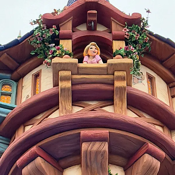 塔の上をよく見ると、ラプンツェルを発見!窓から顔を出して、歌を歌っている様子を見ることができます。