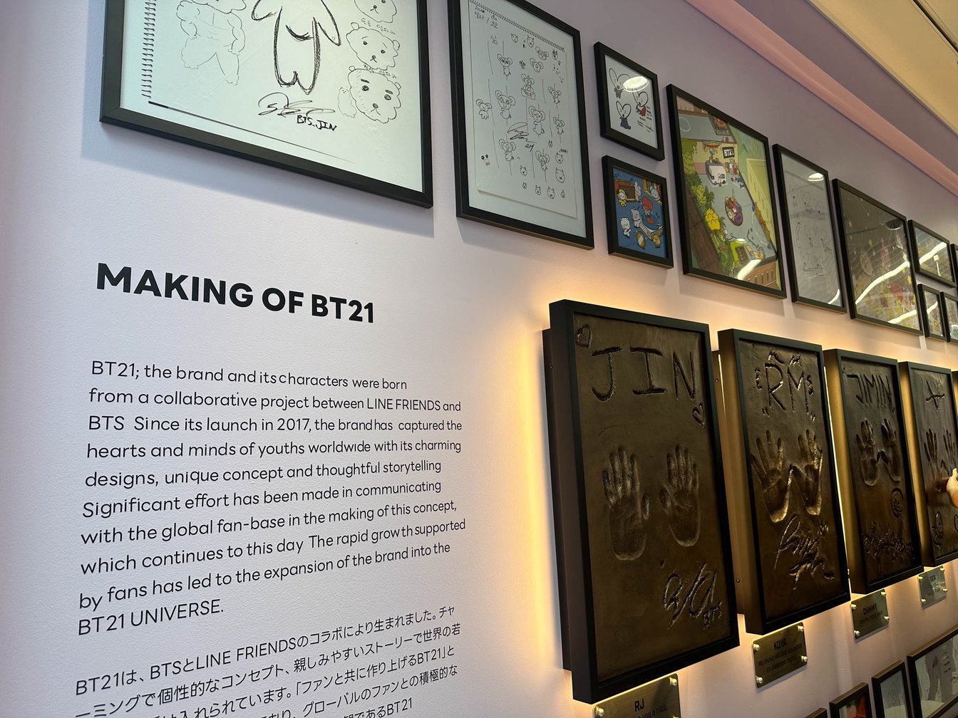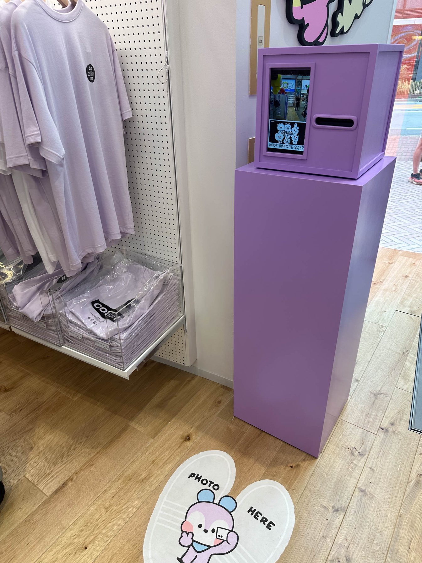 1階は、「BT21」や「うさまる」、「ねこぺん日和」といったラインフレンズが展開するキャラクターグッズを取り扱う常設ストアで、「TOKYO」の文字とキャラクターたちがデザインされたTシャツやミニタオル、横浜文明堂とコラボレーションしたどら焼きといった和菓子類などを同店限定で販売。壁面にはBTSメンバーの手形が展示され、韓国で人気が高まっている「レシート写真機」も無料で体験が可能。