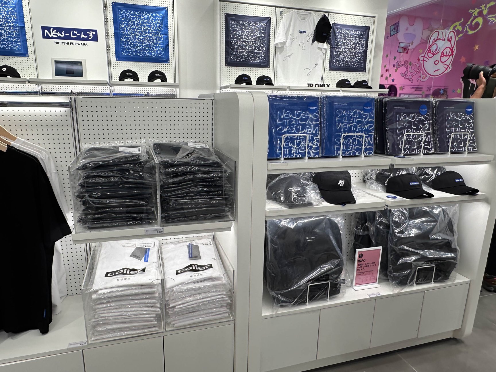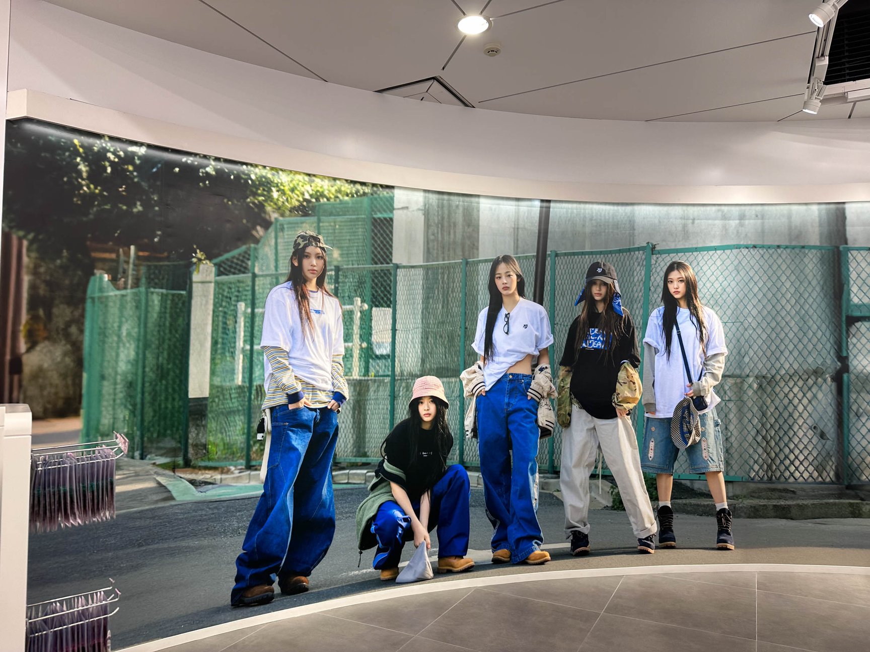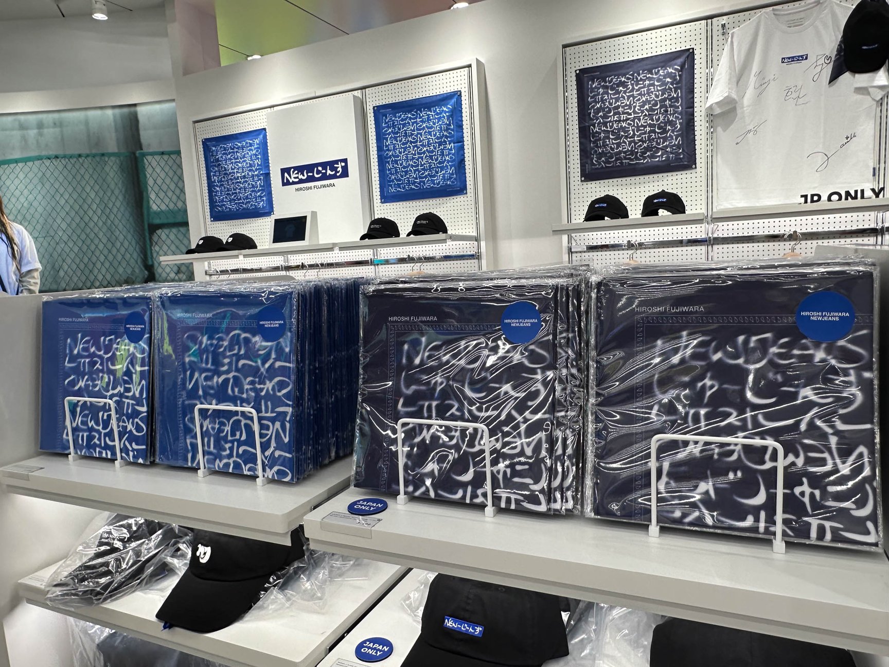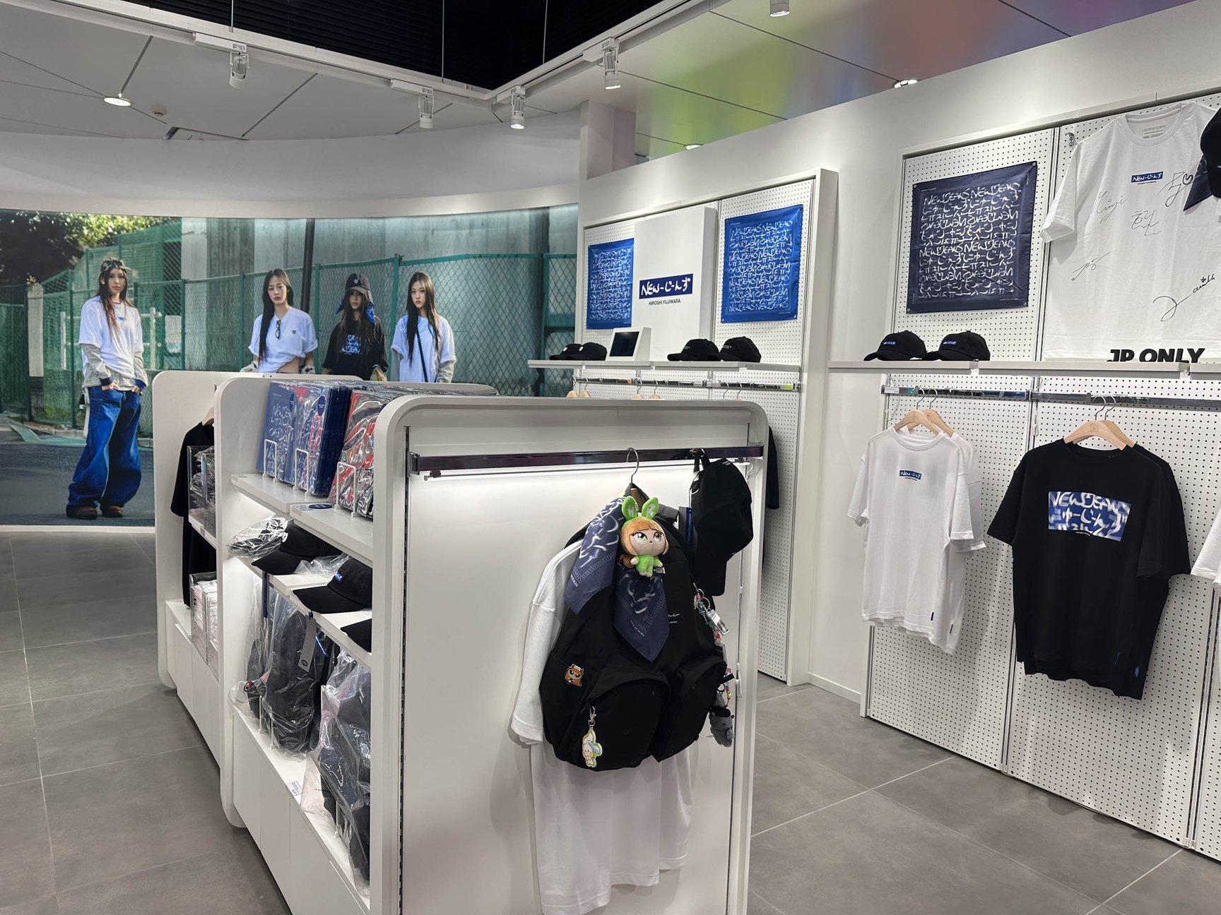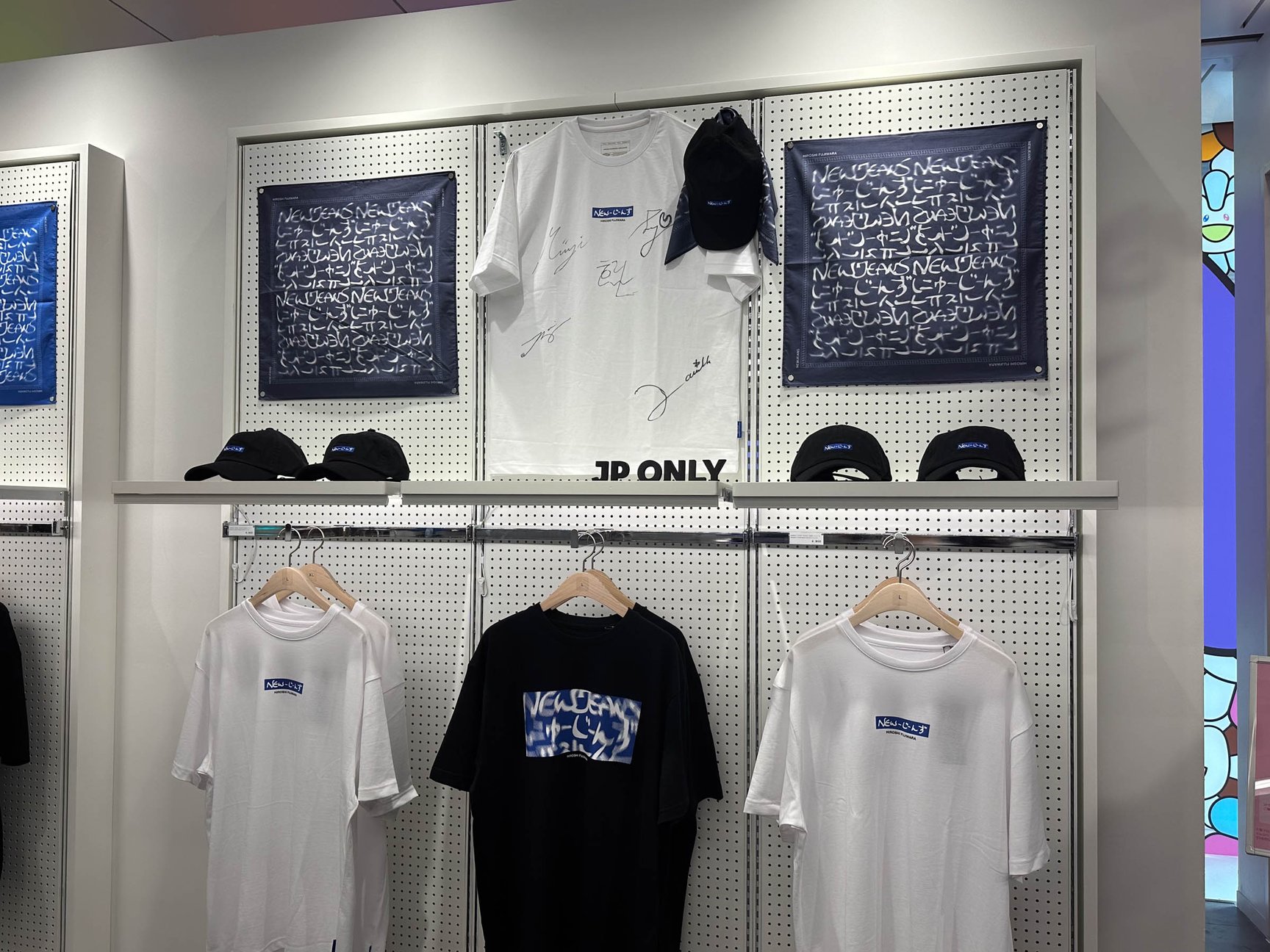 7月15日までのNewJeansのポップアップ期間中は、入り口の大きなスクリーンにNewJeansの動画が映し出され、国内限定展開の「NewJeans × Hiroshi Fujiwara」のTシャツやバンダナ、帽子、バッグなどをラインナップ。このほか、NewJeansのうさぎのキャラクター「Tokki」をラインフレンズの「minini」風にアレンジした新キャラクター「bunini」や、新作の「How Sweet」の衣装をもとにラインフレンズが新たにデザインを加えた「パワーパフガールズ × NJ」のアイテムを展開している。