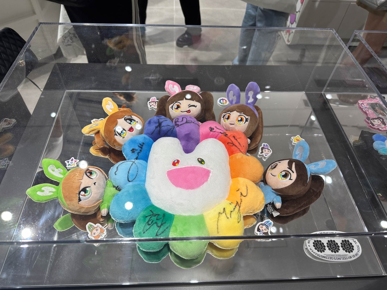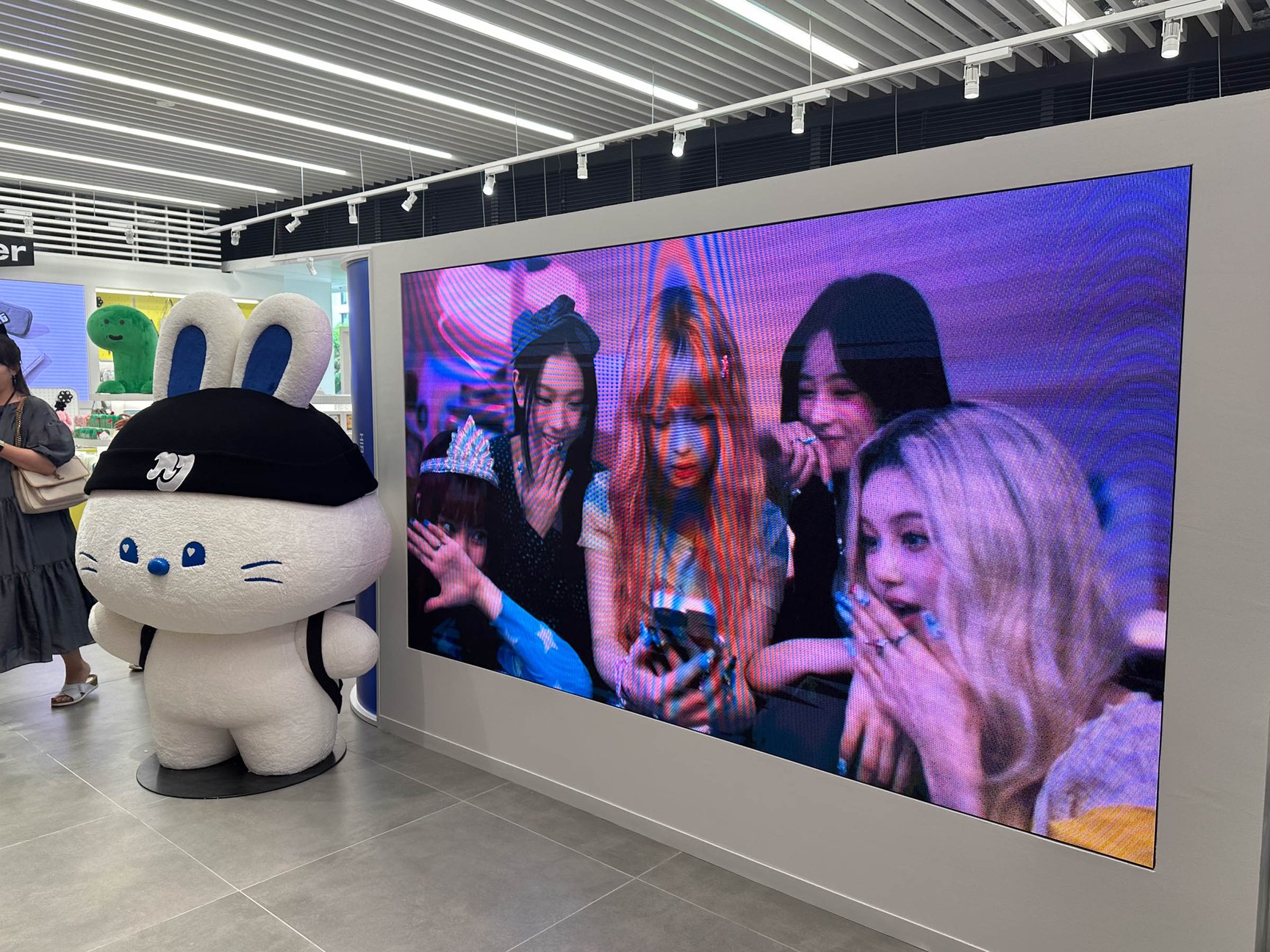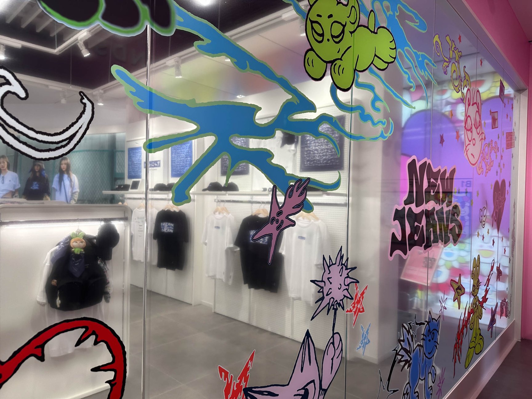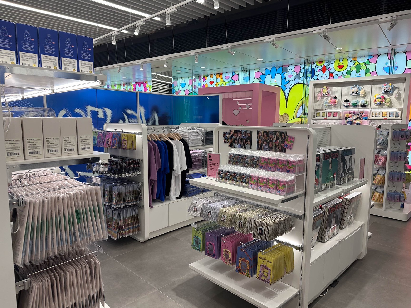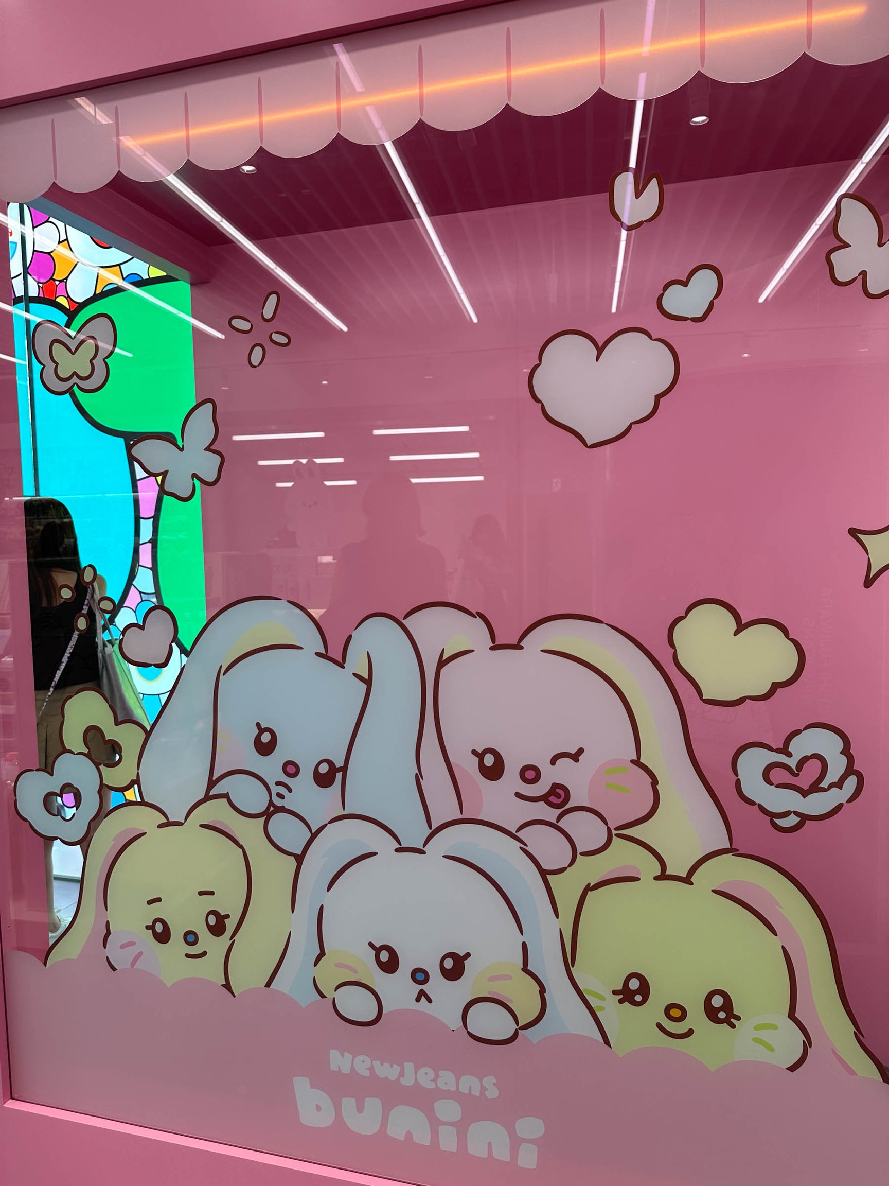 7月15日までのNewJeansのポップアップ期間中は、入り口の大きなスクリーンにNewJeansの動画が映し出され、国内限定展開の「NewJeans × Hiroshi Fujiwara」のTシャツやバンダナ、帽子、バッグなどをラインナップ。このほか、NewJeansのうさぎのキャラクター「Tokki」をラインフレンズの「minini」風にアレンジした新キャラクター「bunini」や、新作の「How Sweet」の衣装をもとにラインフレンズが新たにデザインを加えた「パワーパフガールズ × NJ」のアイテムを展開している。