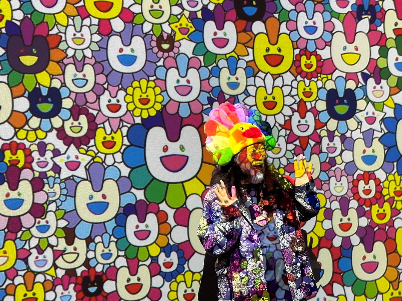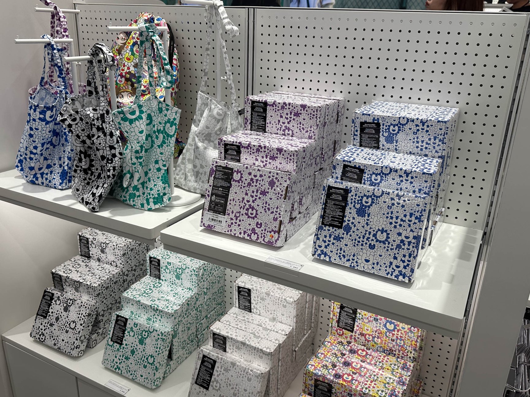 同フロアでは村上隆とのコラボアイテムを販売し、壁面や什器は同氏のアイコニックなモチーフのひとつである「お花」をアレンジしたアートで装飾されている。オープン前に来店した村上隆は、映像を鑑賞しながら楽しそうにリズムに乗る様子を見せた。