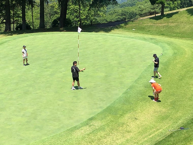 ラウンド中は「仕事の話はほとんどしない」が、しゃべりながらできるスポーツというのがゴルフの良さ。スコアよりも楽しみ、交流を目的にしている。年始には合宿も。初心者から全国大会入賞者まで、分け隔てなくいそしんでいる。