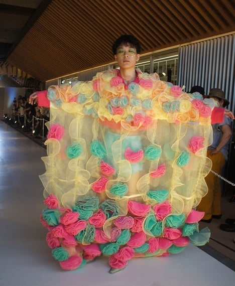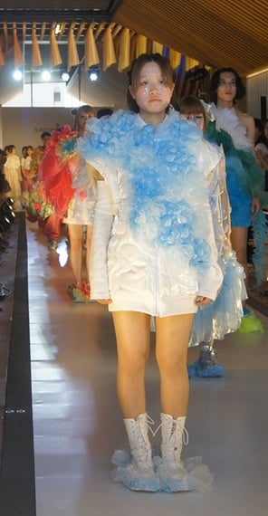 ショーのテーマは「色あふれる未来」。衣装は金沢文化服装学院の学生がデザイン、ドレスデザイナーの小泉智貴氏がアドバイザーとして参画した。サンコロナ小田のオーガンディなどを使って、繭の白い殻にこもったようなコスチュームから最後は色あふれる自分を表現する多彩な色使いのドレスへと12体の作品をストーリー仕立てで披露した。