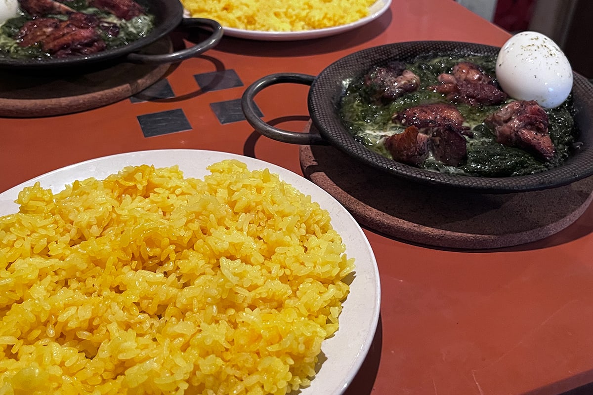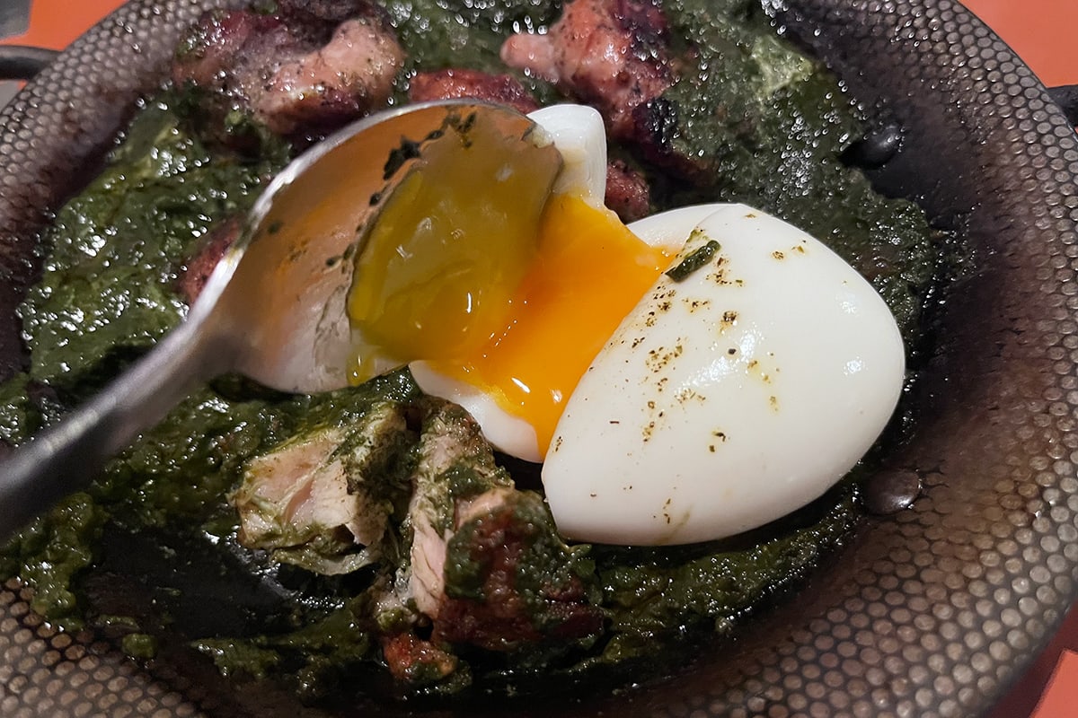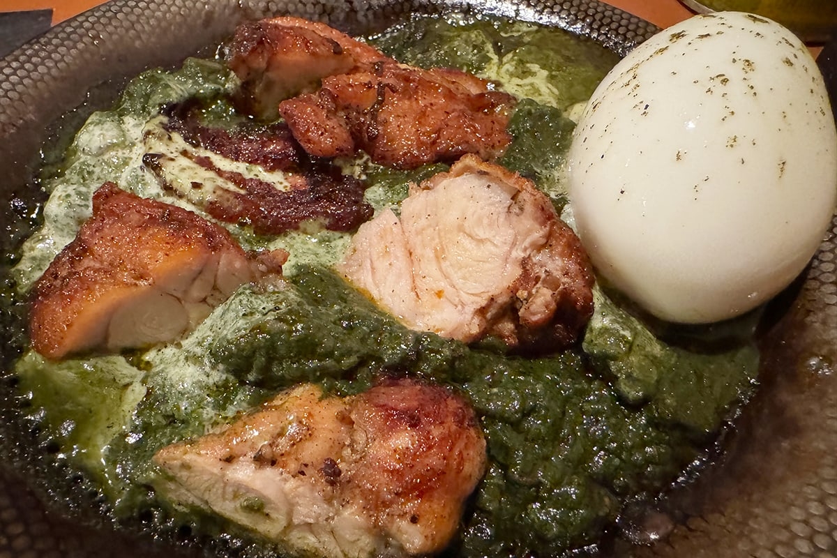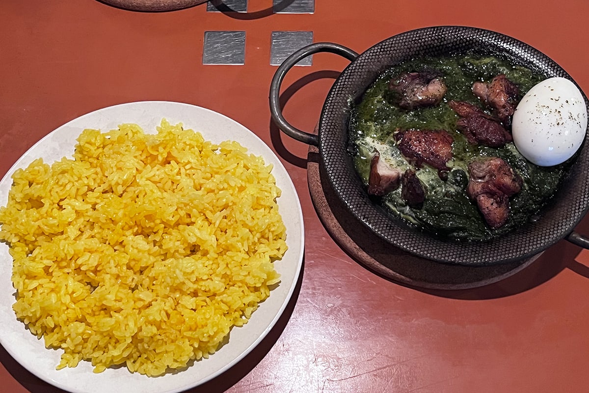 鉄皿に乗せられた、濃厚なルーと黄金に輝くサフランライスが運ばれてくると否応なしにテンションが上がる。ホウレン草の旨味とスパイスが凝縮された深いグリーン、ツヤっとしたオイル感の中に食欲をそそるゴロゴロのチキン。まるで迷彩柄のようなルックスから、ストリートカルチャーを感じずにはいられない佇まい。