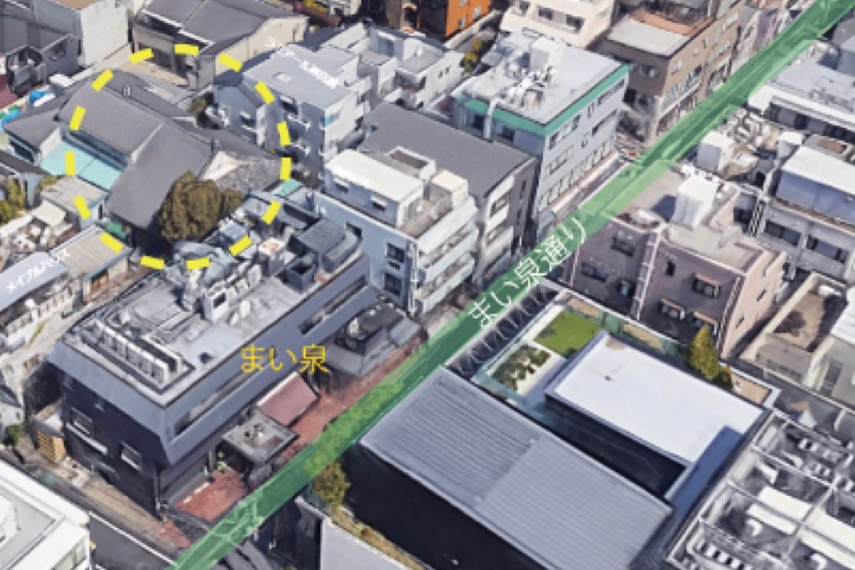 航空写真で見ると、いまも現存する銭湯らしい趣きある建物が見てとれる(まい泉通り側の売店脇からも建物の瓦屋根を奥に見ることが可能だ)。