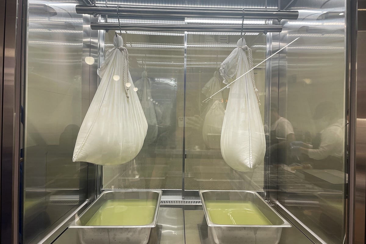 まるでサンタクロースが担いでいる袋のような特大サイズで、間近で見ると、ホエーがポタポタと1滴ずつ落ちていくのが分かる。