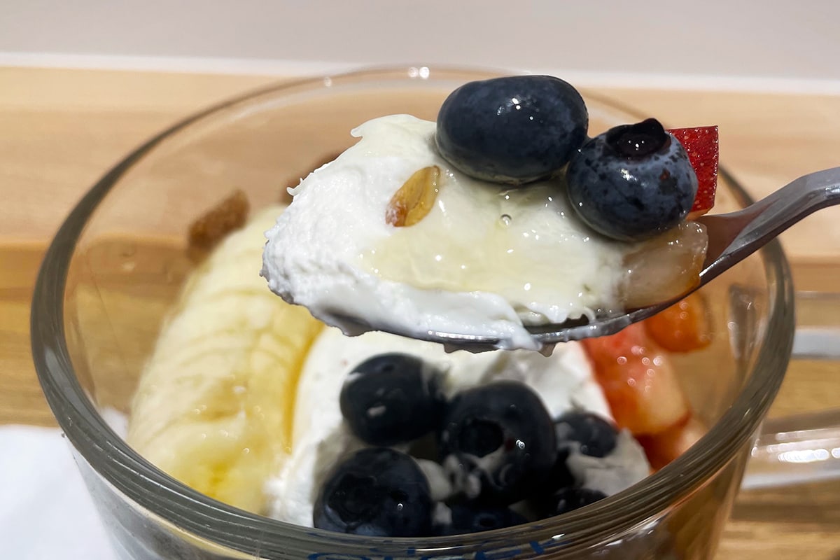 濃厚なグリークヨーグルトをスプーンですくうと、ブルーベリーやイエローピーチが、ヨーグルトに吸い付き、一緒に持ち上がる。さっそくひとくち。ホエーを85%除去した”シグネチャー”ヨーグルトは、クリームチーズと言って良いほど、こっくりしっかりした食感でおいしい。