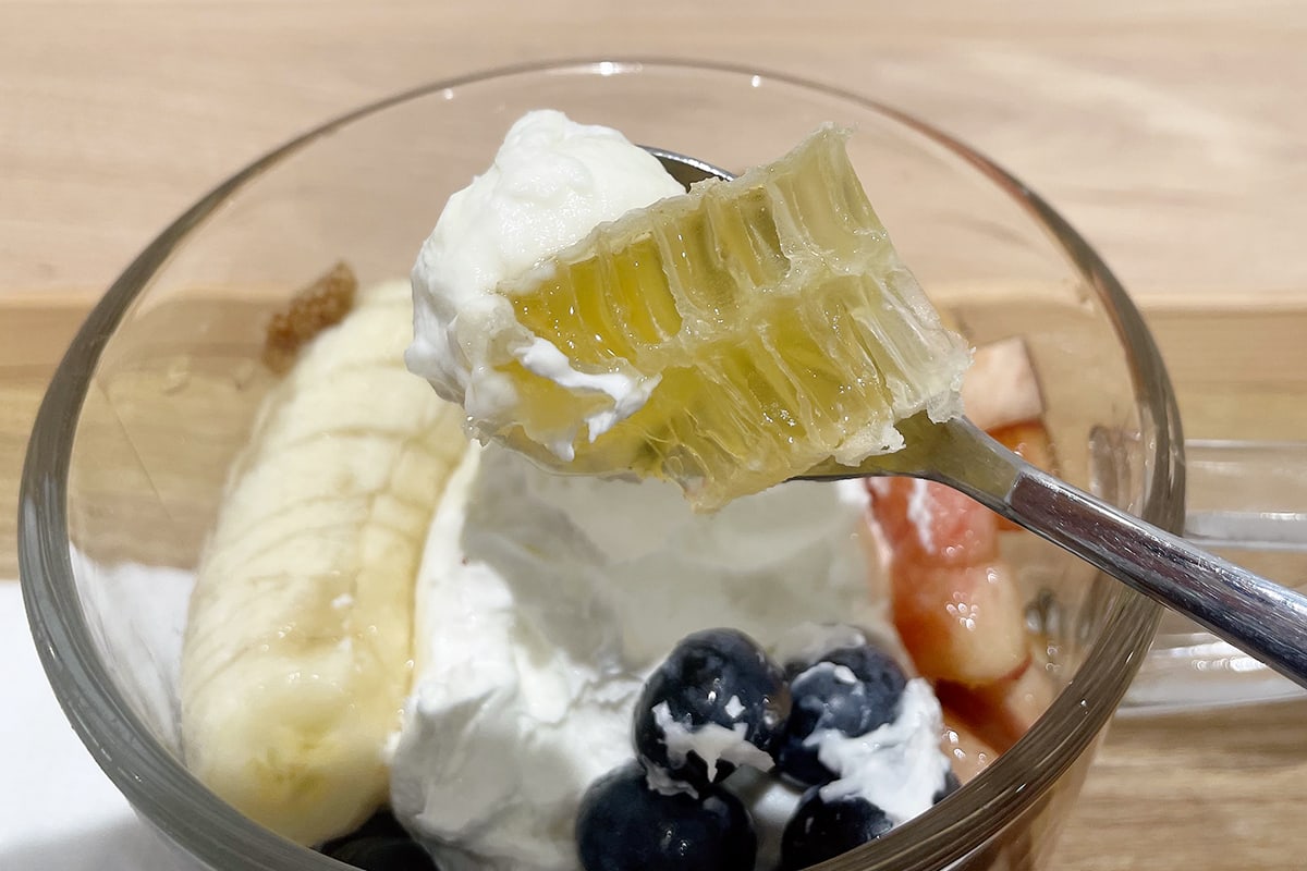 しばらくヨーグルト本来の味わいを楽しんだら、お次はつやつやのコムハニーをプラス。しっかりと水切りした”シグネチャー”は、ヨーグルト特有の酸味を減らしているので、ハチミツと一緒に食べるとその甘味がさらに際立つ。ヨーグルトとはちみつダブルの甘さとコクをダイレクトに感じられるのだ。食感も更なるもっちりへと変身する不思議。ボウルの下にたっぷり敷かれているザクザクのグラノーラとハチミツの相性も抜群でぺろっと平らげてしまった。?